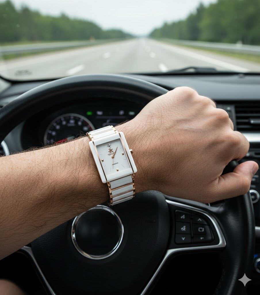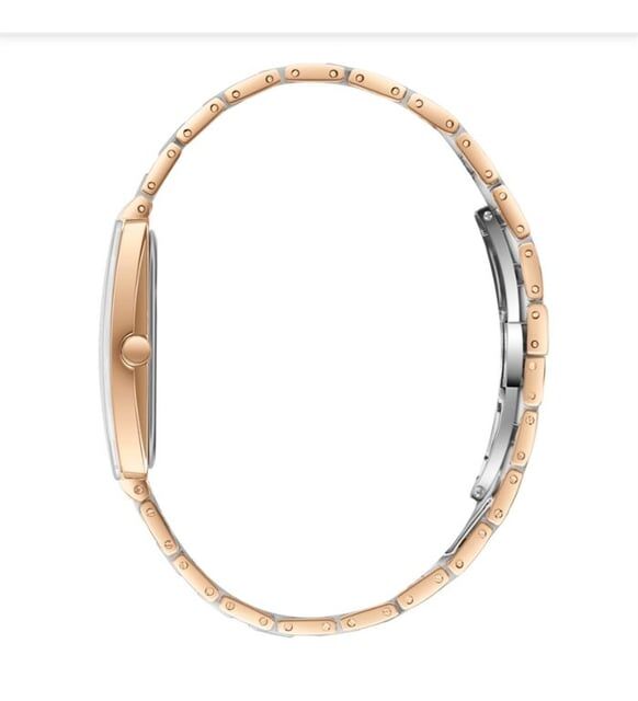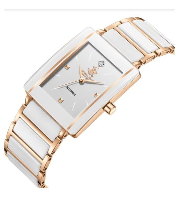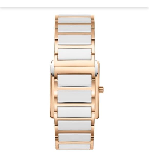 Rose gold çelik gövde ve seramik yan paneller, şıklığı teknik dayanıklılıkla birleştirir. Kare-dikdörtgen kasası, klasik yuvarlak saatlerden farklı bir görünüm arayan kullanıcılara sofistike bir alternatif sunar.