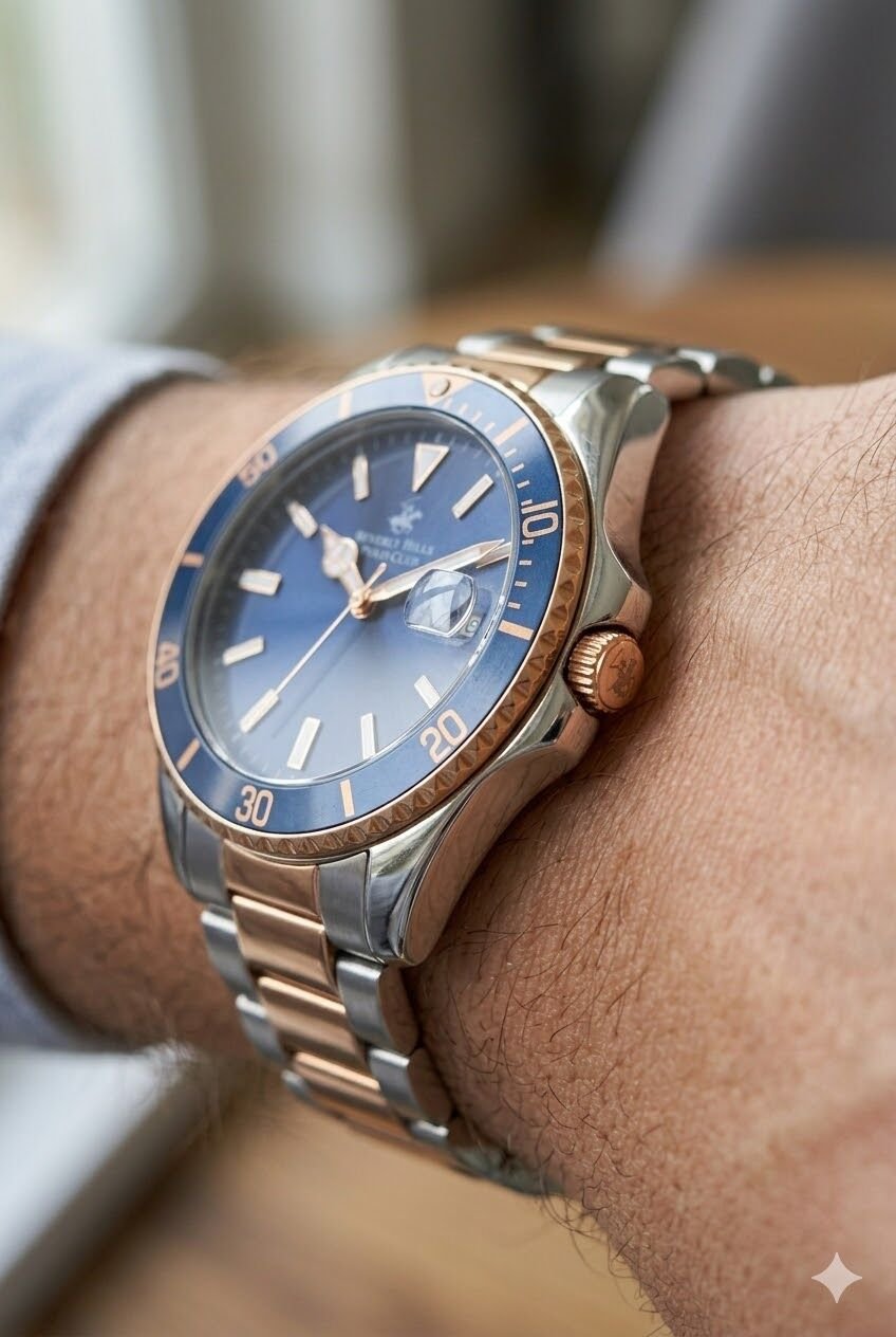 Beverly Hills Polo Club erkek kol saati lacivert kadranı ve rose gold detaylı bezel yapısı ile güçlü ve dikkat çekici bir görünüm sunar. Çift renk çelik kordon tasarımı saate premium bir hava katarken, sportif çizgiler ile modern stil bir araya getirilmiştir. Günlük kullanımda ve özel kombinlerde rahatlıkla tercih edilebilir.