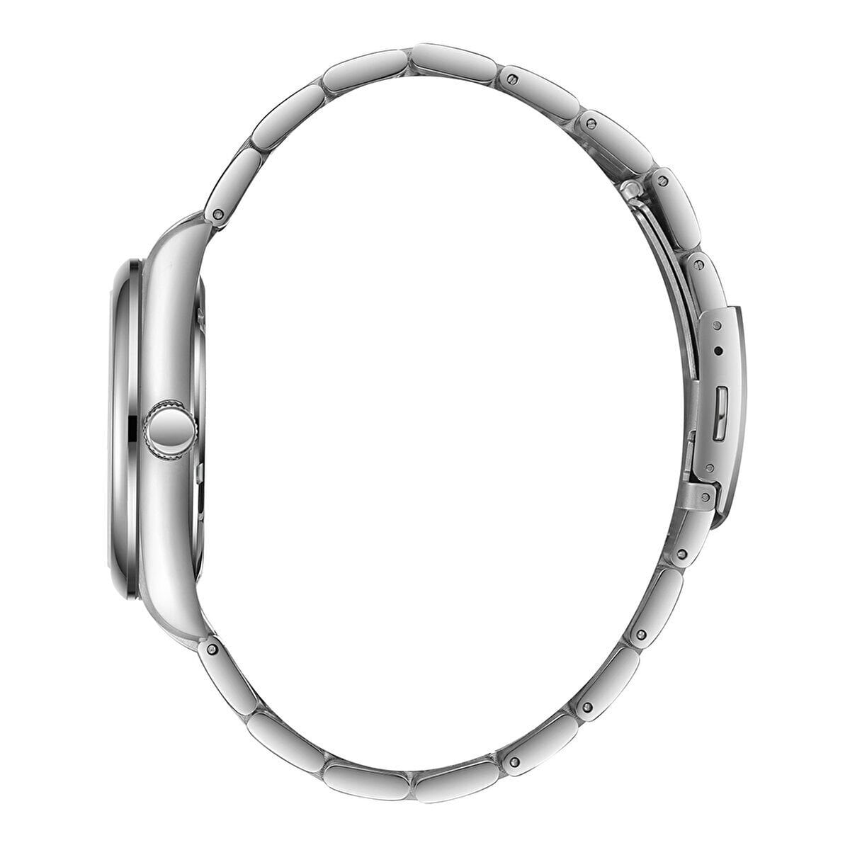 Paslanmaz çelik kordon hem dayanıklı hem de uzun ömürlü kullanım sağlar. Gümüş tonlu yapısı ile saatin genel tasarımına uyum sağlayarak bilekte şık ve dengeli bir görünüm sunar.