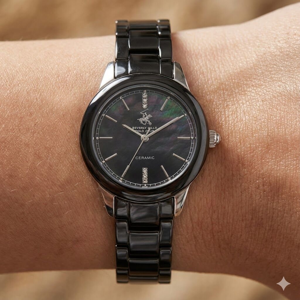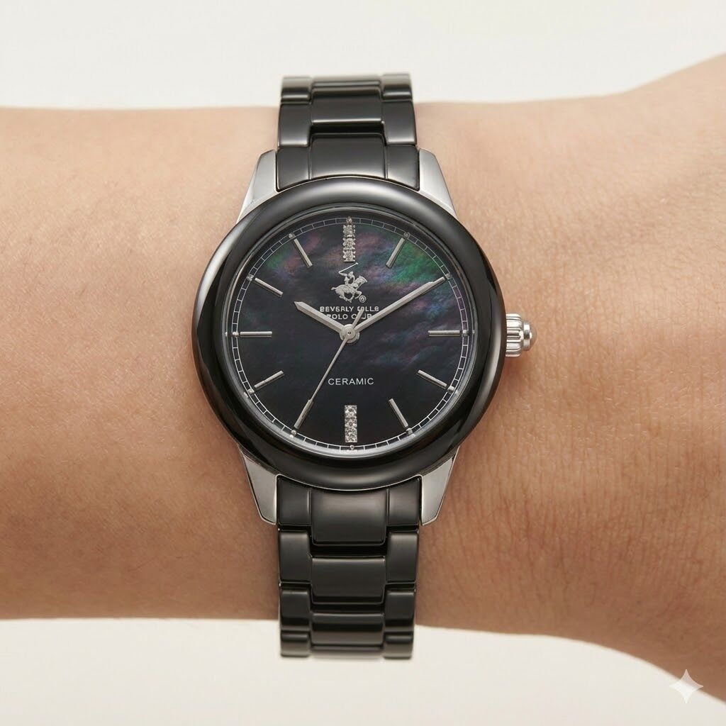 Beverly Hills Polo Club kadın kol saati; 35 mm çelik kasası, siyah seramik kordonu ve sedef efektli siyah kadran tasarımıyla modern ve premium bir şıklık sunar. Parlak seramik bezel ve zarif indeks detayları, saatin sofistike duruşunu güçlendirir.
