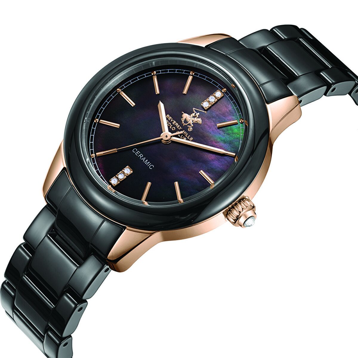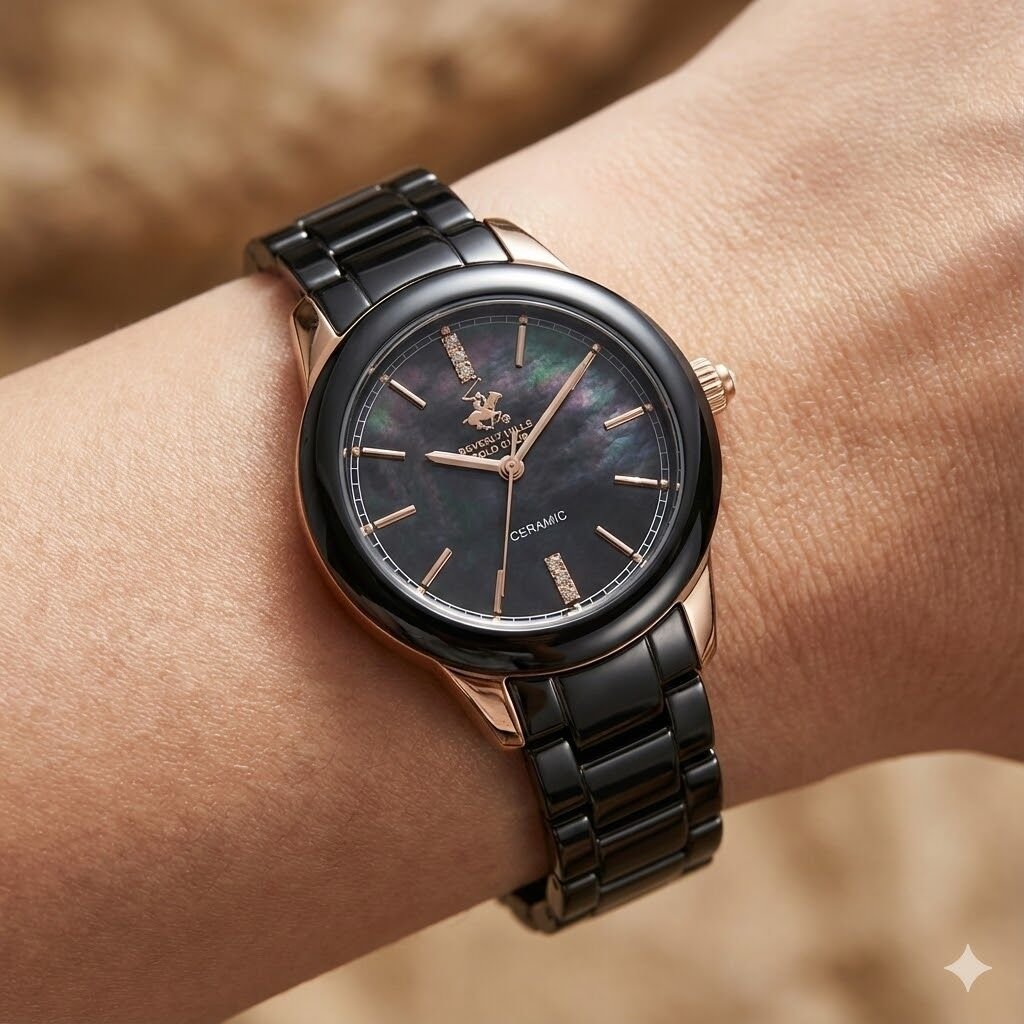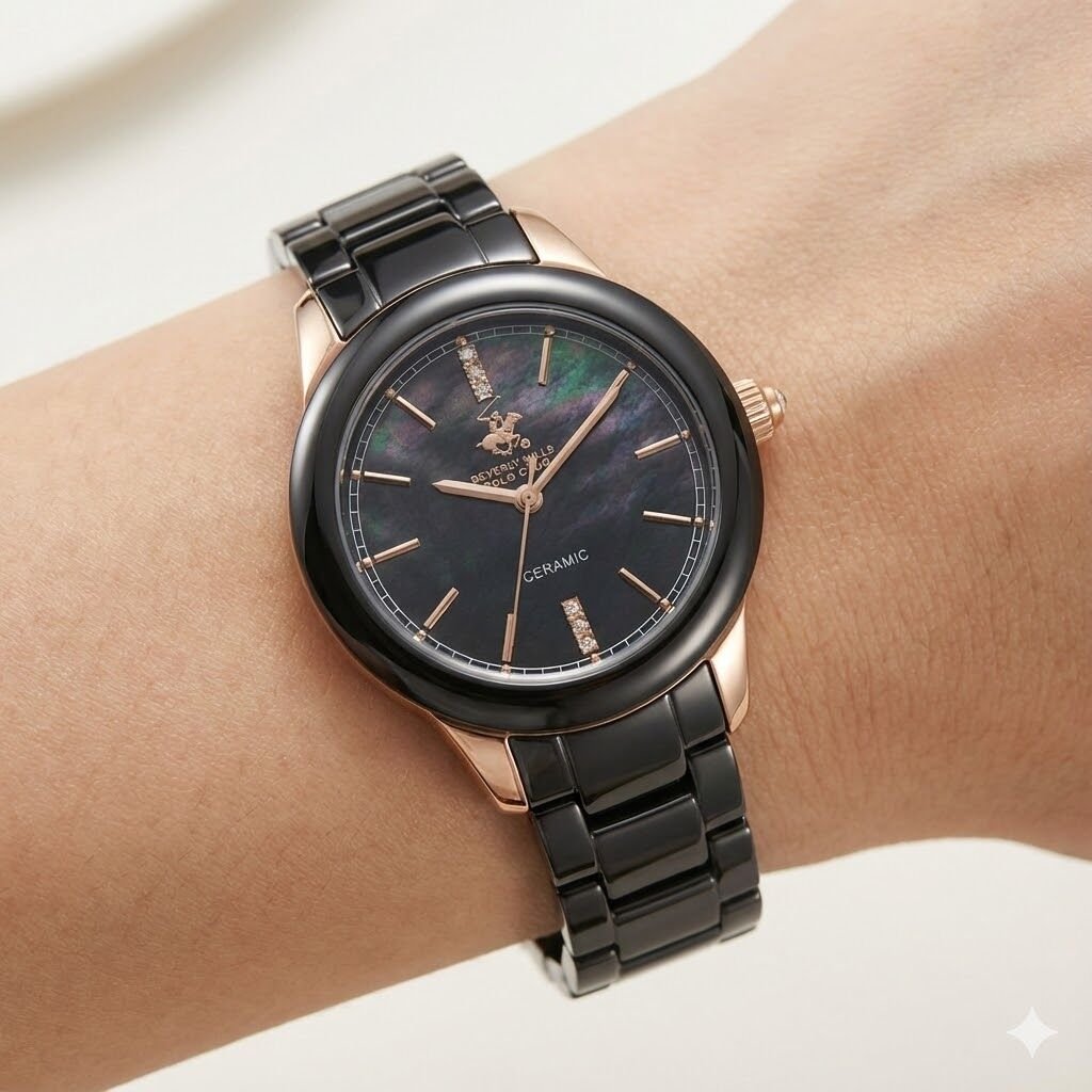 Beverly Hills Polo Club kadın kol saati; 35 mm çelik kasası, siyah seramik kordonu ve sedef efektli siyah kadran tasarımıyla sofistike bir şıklık sunar. Rose gold tonlu detaylar ve taşlı indeksler, saatin zarif duruşunu tamamlar.