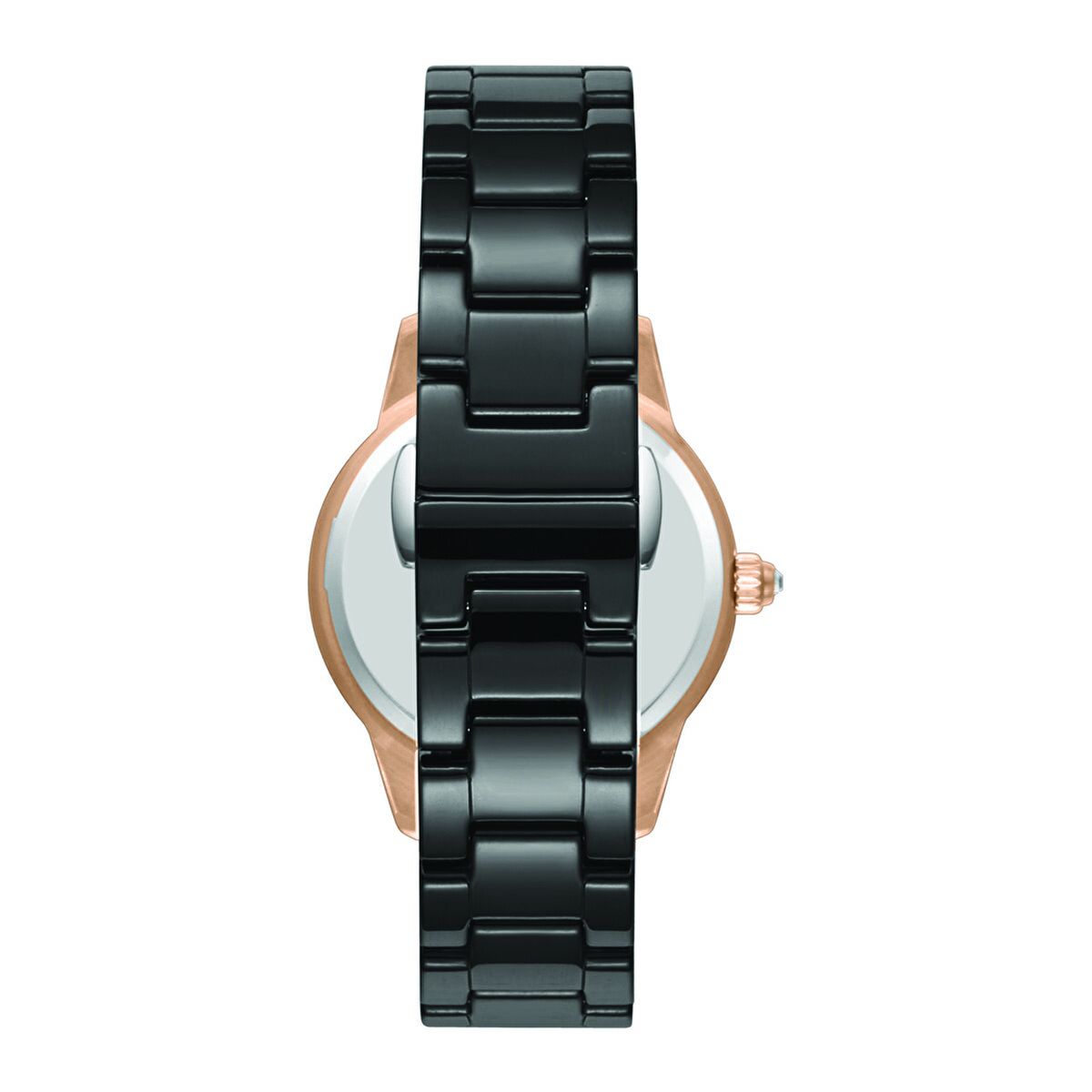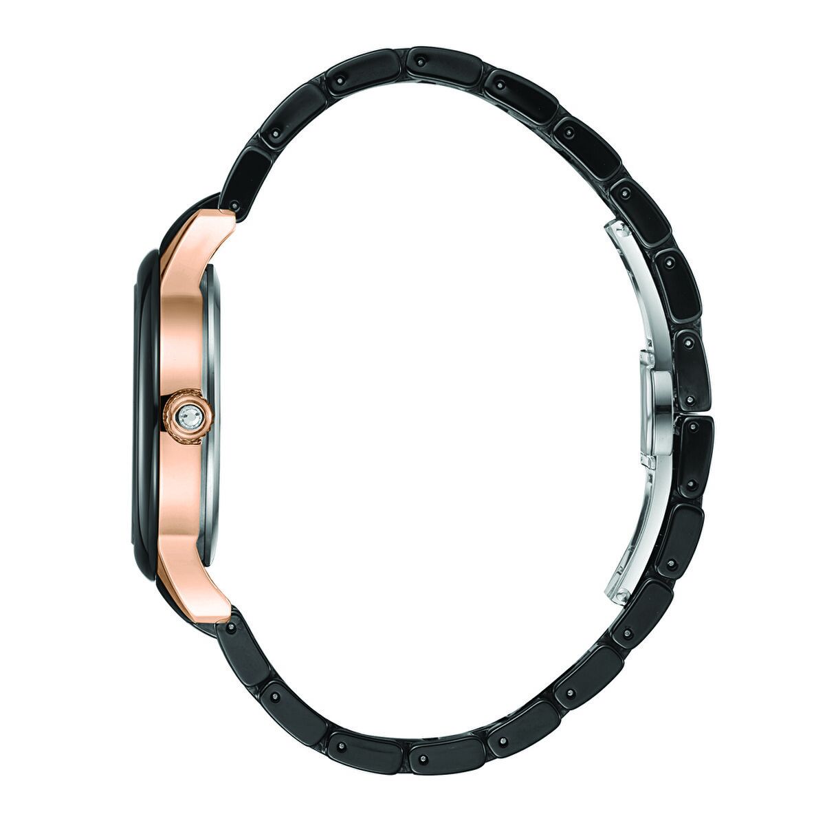 Siyah seramik bezel ve kordonun parlak dokusu, saatin modern ve premium algısını güçlendirir. Rose gold akrep-yelkovan ve taşlı indeksler, kadran üzerinde dengeli ve şık bir kontrast oluşturur.