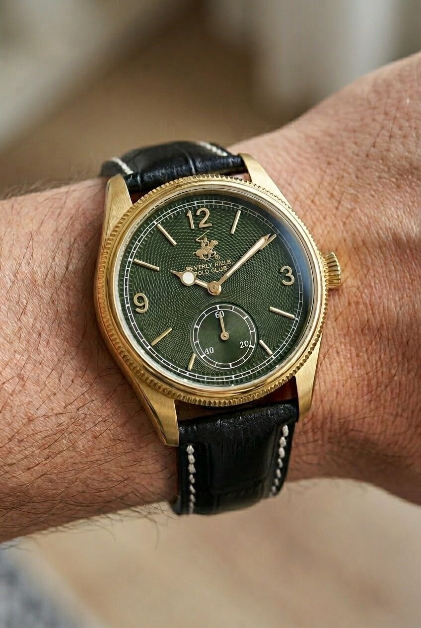 Beverly Hills Polo Club erkek kol saati koyu yeşil kadranı ve gold tonlu detayları ile dikkat çekici ve farklı bir stil sunar. Minimalist indeksler ve alt saniye göstergesi saatin estetik görünümünü destekler. Klasik ve modern tarzın birleştiği bu model, stiline özgün dokunuş katmak isteyenler için idealdir.