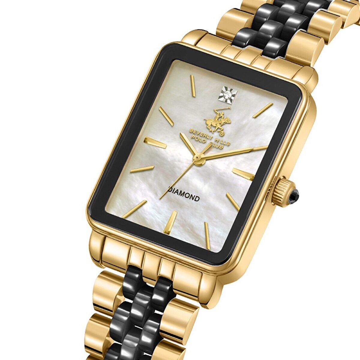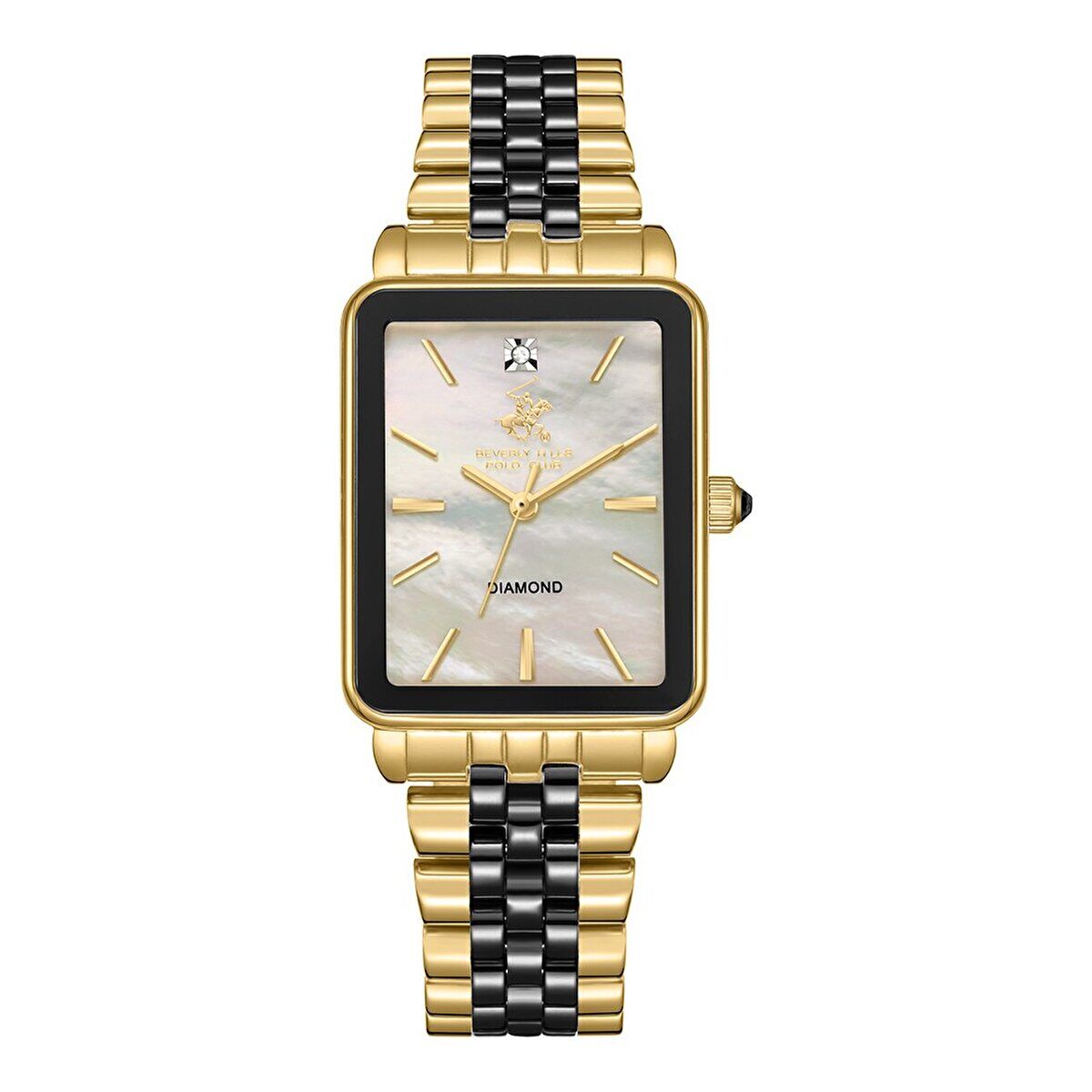 Beverly Hills Polo Club Pırlantalı Kadın Kol Saati | 24 mm Çelik Dikdörtgen Kasa, Sarı-Siyah Çelik Kordon, 24mm