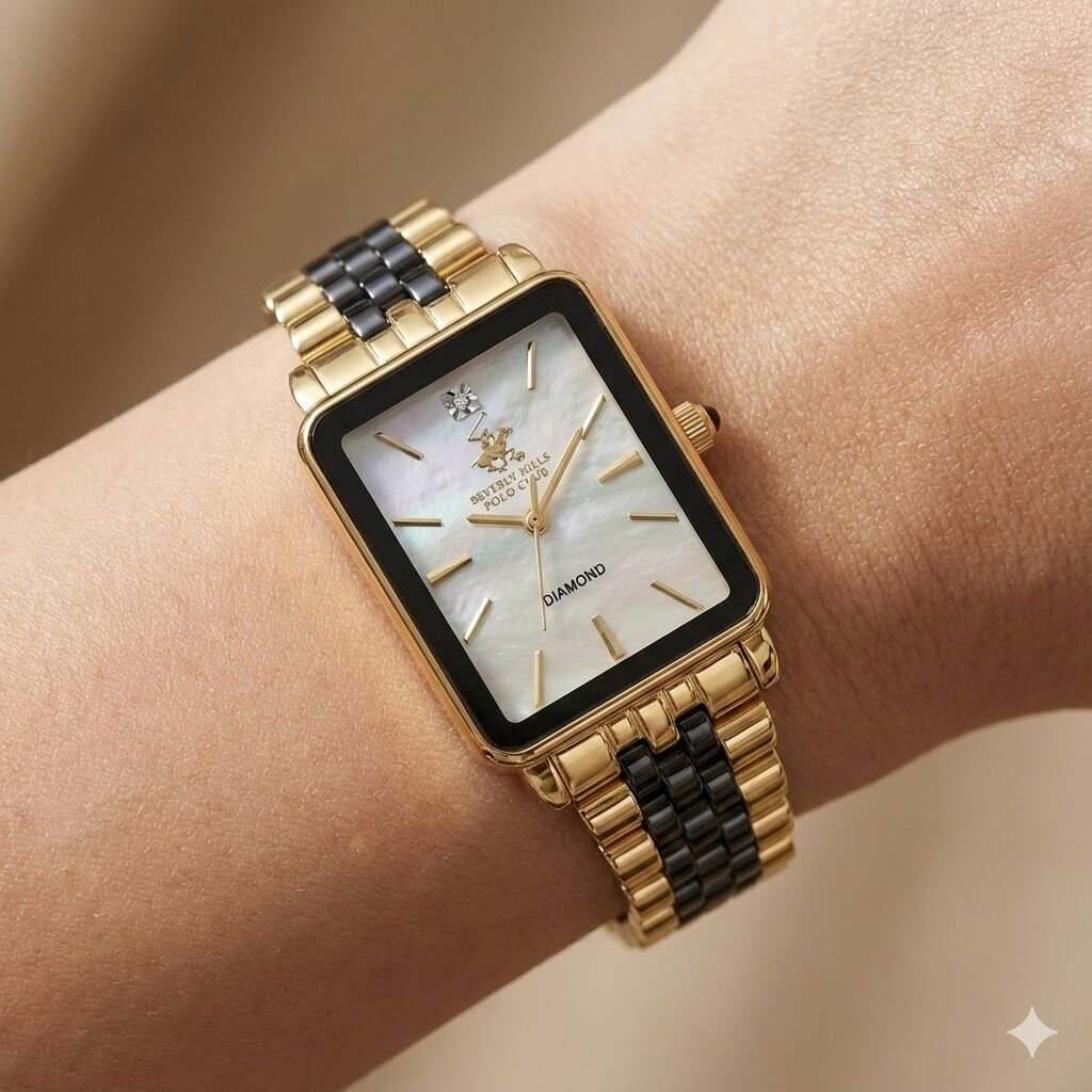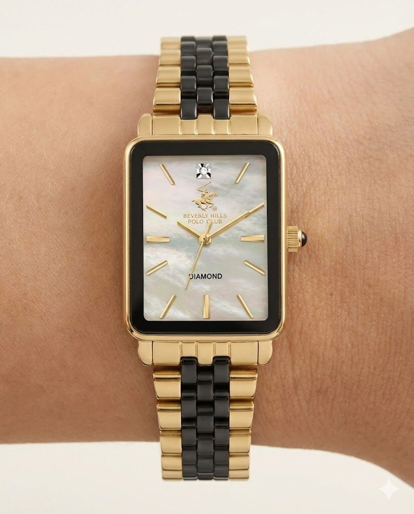 Beverly Hills Polo Club kadın kol saati; 24 mm dikdörtgen formdaki çelik kasası, sarı-siyah çelik kordonu ve sedef kadranıyla klasik zarafeti modern detaylarla buluşturur. Saat 12 yönünde yer alan gerçek pırlanta taşı, modele özel ve prestijli bir dokunuş kazandırır.