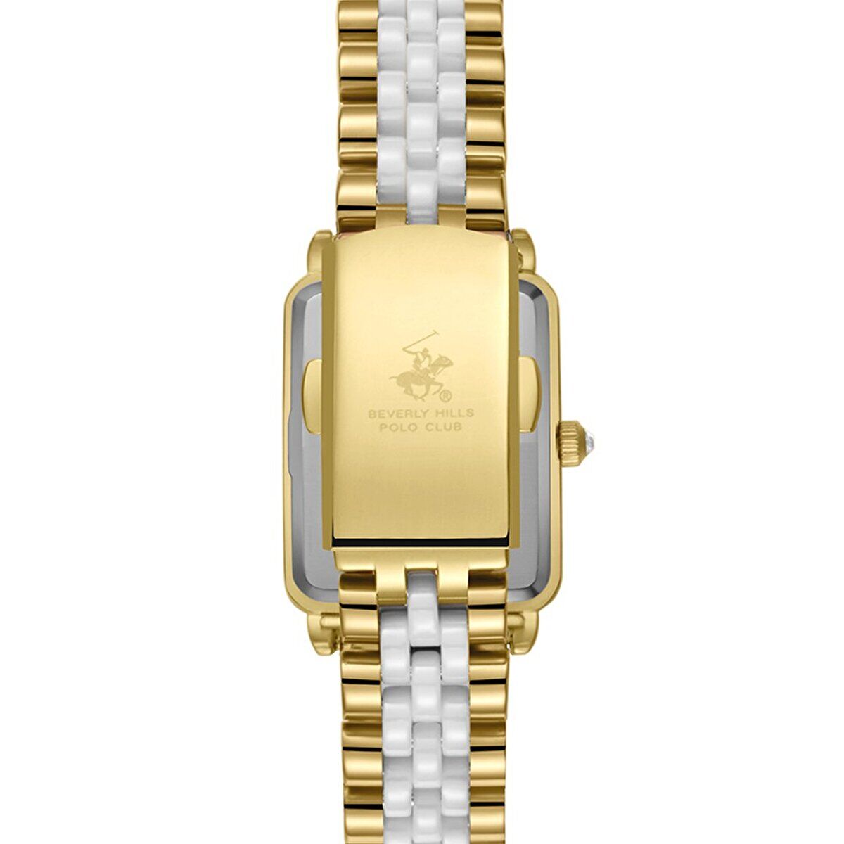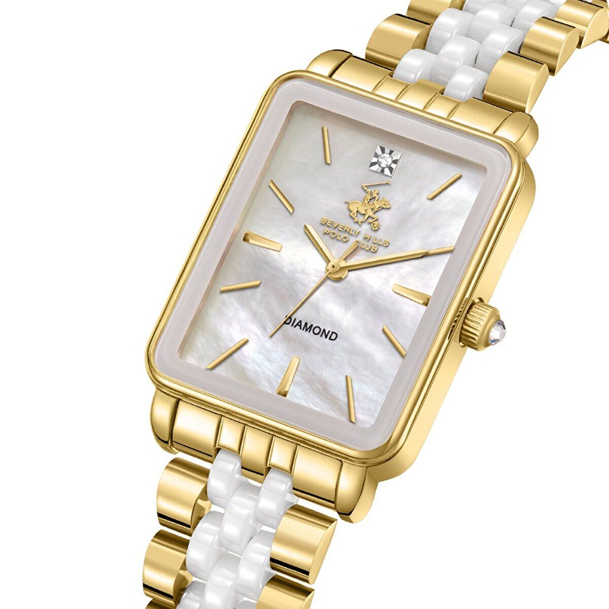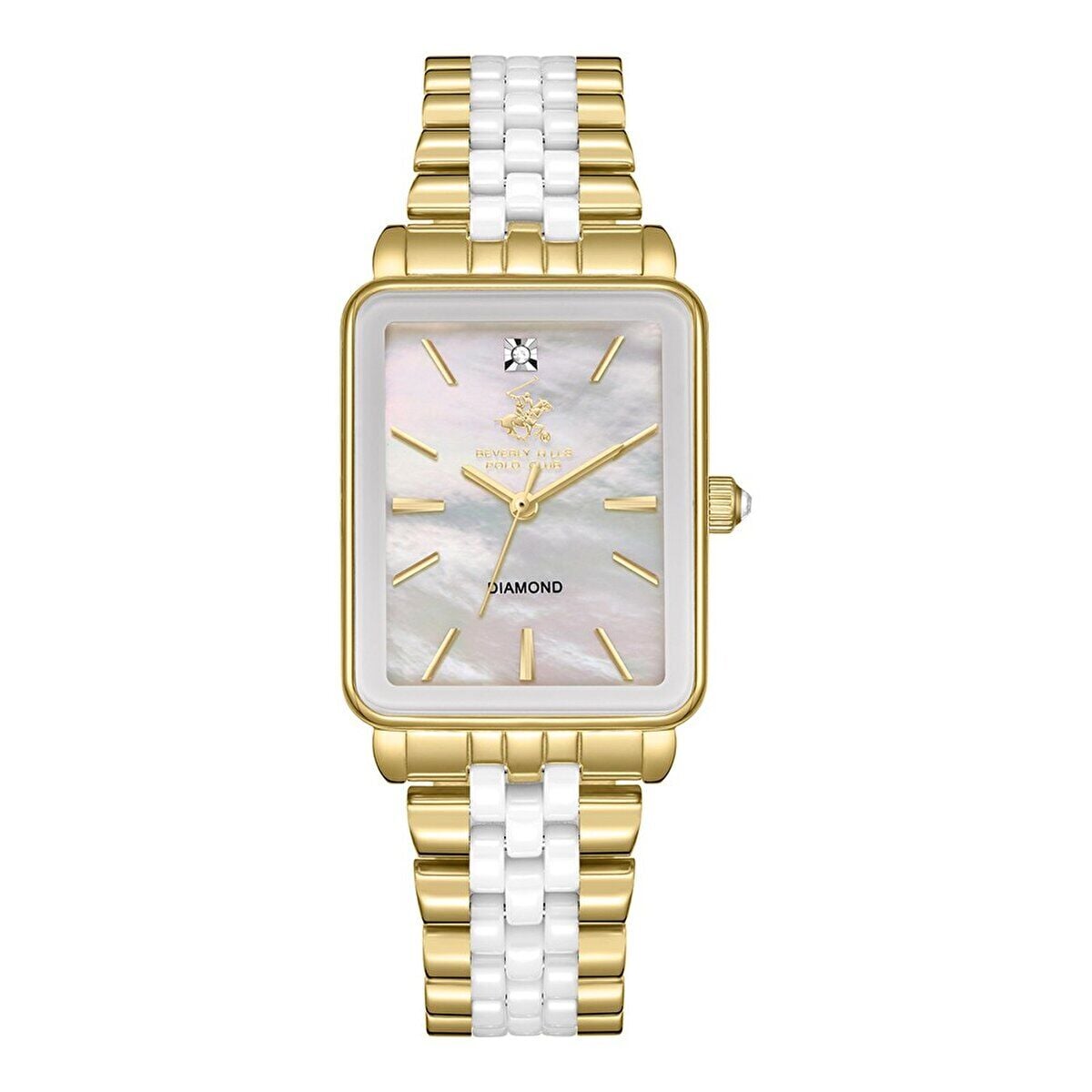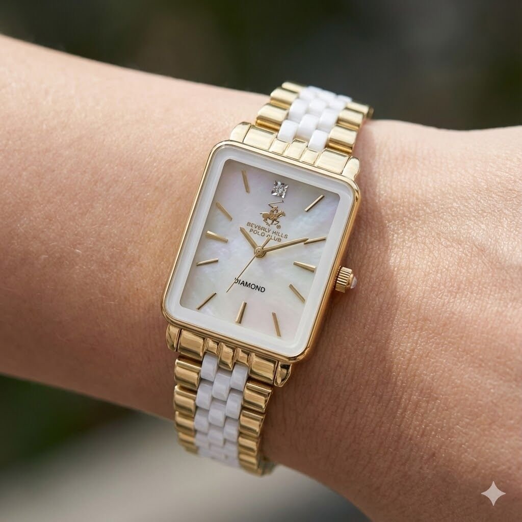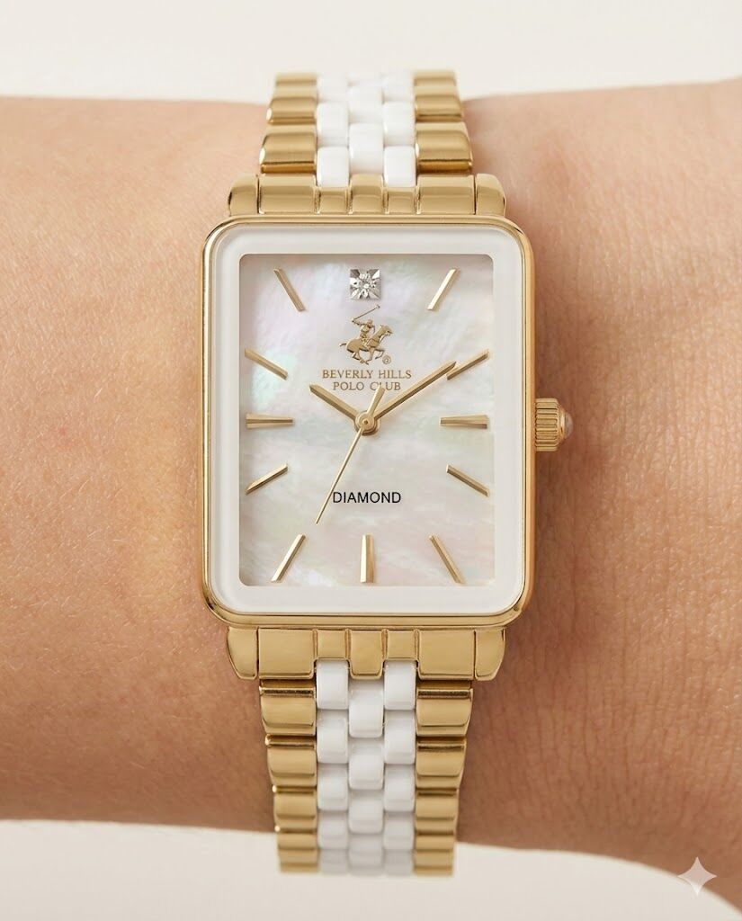 Beverly Hills Polo Club kadın kol saati; dikdörtgen formdaki zarif kasası, altın-beyaz çelik kordonu ve sedef kadran tasarımıyla klasik şıklığı modern bir dokunuşla tamamlar. Saat 12 yönünde yer alan gerçek pırlanta taşı, modele prestijli ve özel bir karakter kazandırır.