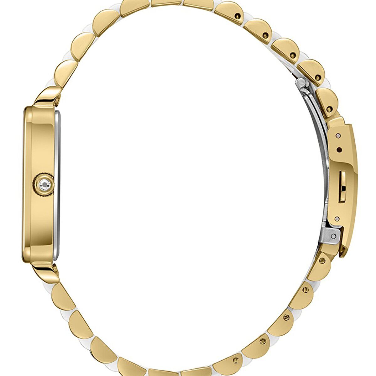 Altın-beyaz renkli çelik kordon; sağlam yapısı ve konforlu kullanımıyla öne çıkar. İki renkli görünümü sayesinde saati daha dikkat çekici hale getirir.
