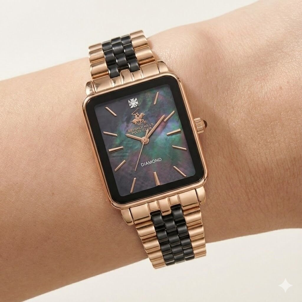 Beverly Hills Polo Club kol saati; dikdörtgen formdaki zarif kasası, siyah-rose gold çelik kordonu ve sedef kadran tasarımıyla klasik şıklığı modern detaylarla buluşturur. Saat 12 yönünde yer alan gerçek pırlanta taşı, modele prestijli ve özel bir karakter kazandırır.