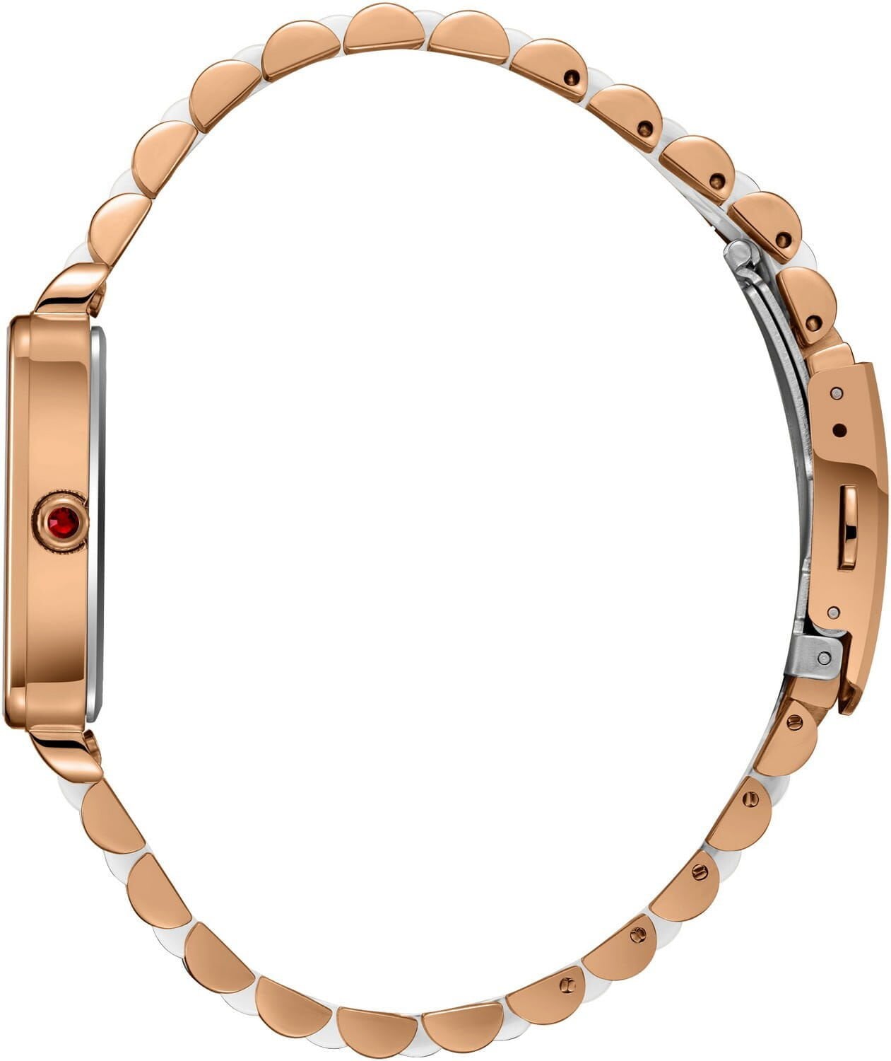 Rose gold-beyaz çelik kordon; sağlam yapısı, pürüzsüz yüzeyi ve konforlu kullanımıyla öne çıkar. İki renkli tasarım saatin premium algısını güçlendirir.