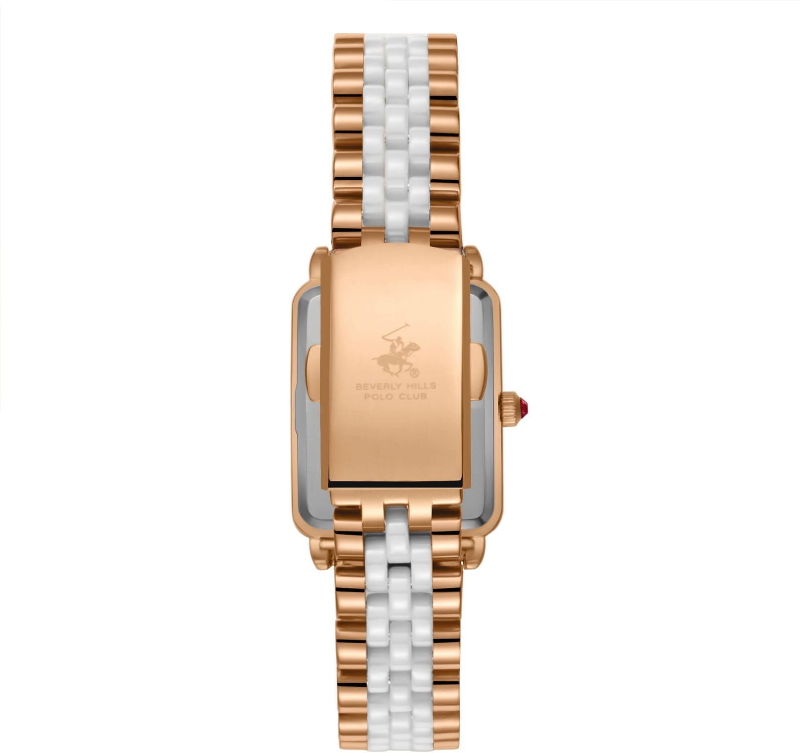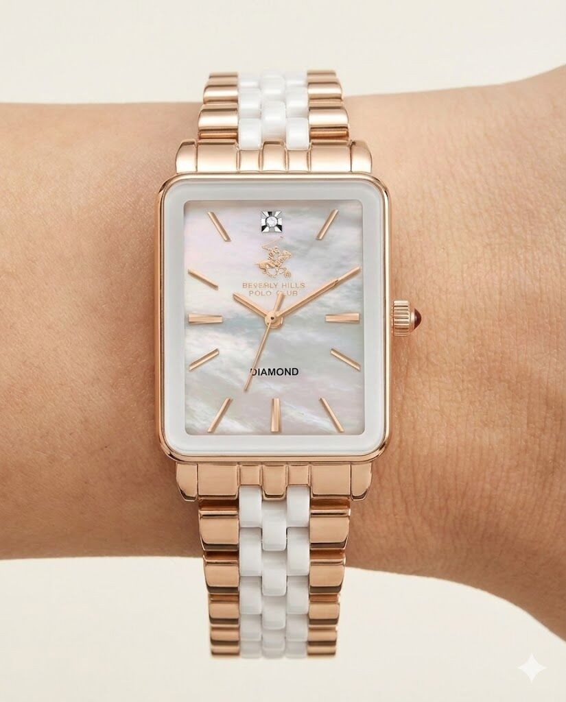 Beverly Hills Polo Club kadın kol saati; dikdörtgen formdaki zarif çelik kasası, rose gold-beyaz renkli çelik kordonu ve sedef kadran tasarımıyla klasik şıklığı modern detaylarla birleştirir. Saat 12 yönünde yer alan gerçek pırlanta taşı, modele prestijli ve özel bir karakter kazandırır.