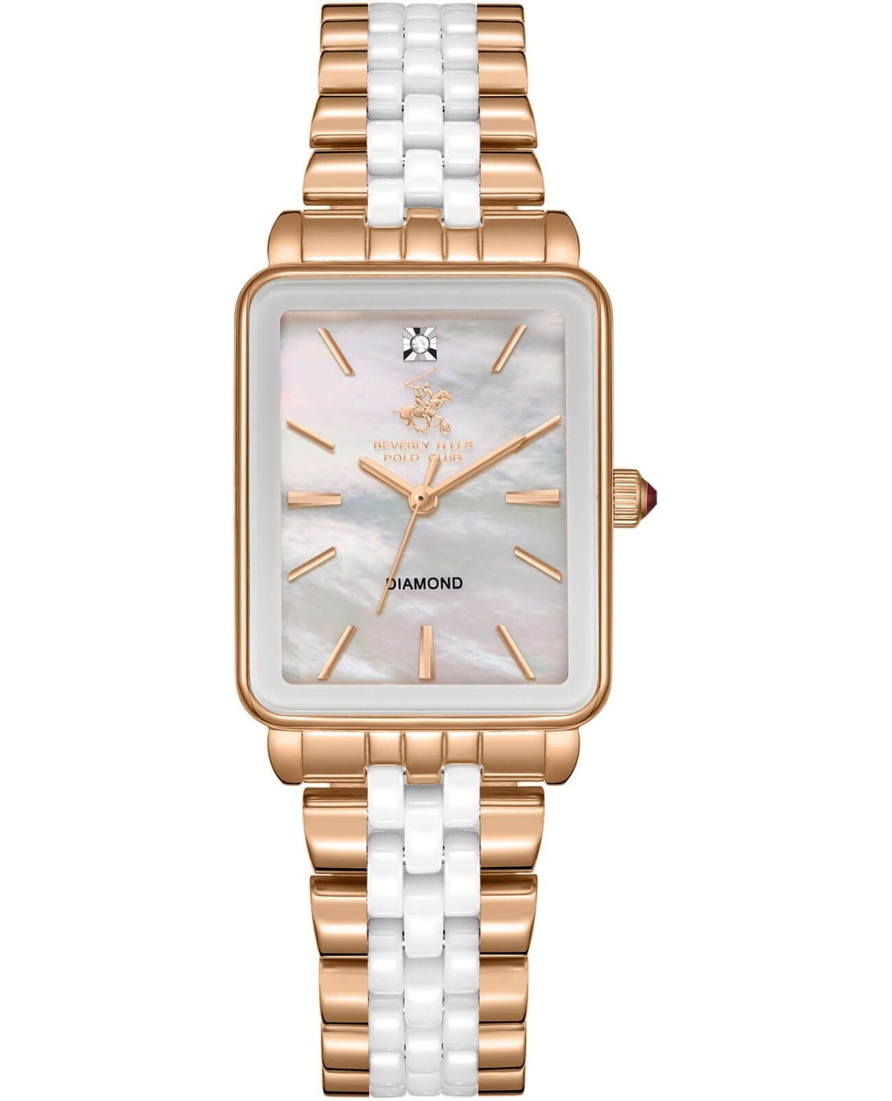 Beverly Hills Polo Club Pırlantalı Kadın Kol Saati | 24 mm Rose Gold Dikdörtgen Kasa, Rose Gold-Beyaz Çelik Kordon, Sedef Kadran