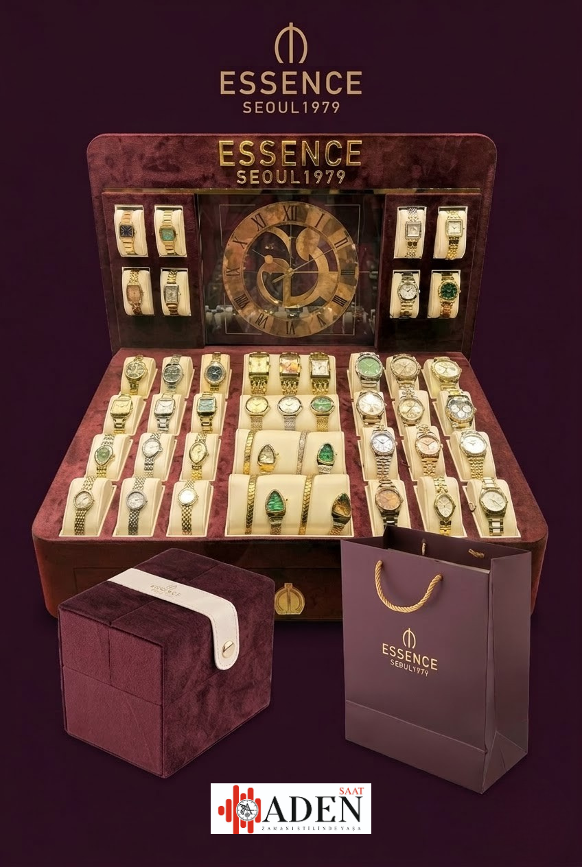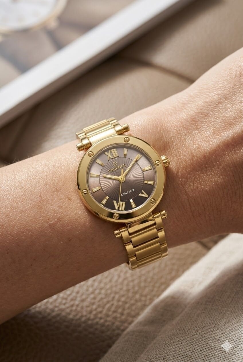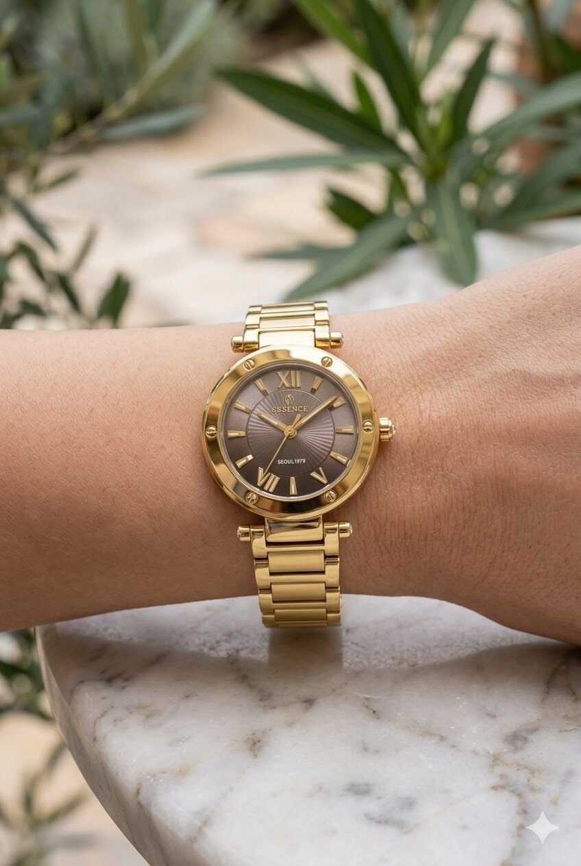 Essence kadın kol saati gold tonlu kasa ve kordon yapısı ile zarif bir görünüm sunar. Koyu kahverengi kadran detayı modele sıcak ve sofistike bir karakter kazandırır. Modern çizgileri sayesinde hem günlük kombinlerde hem de özel gün stilinde şık bir tamamlayıcı olarak öne çıkar.