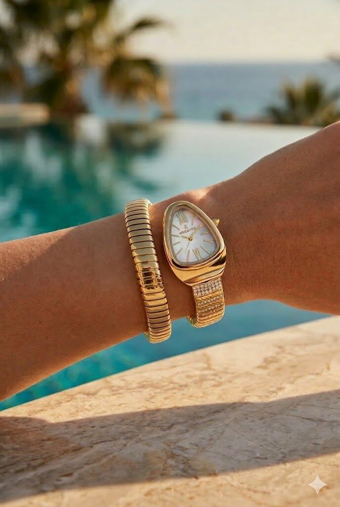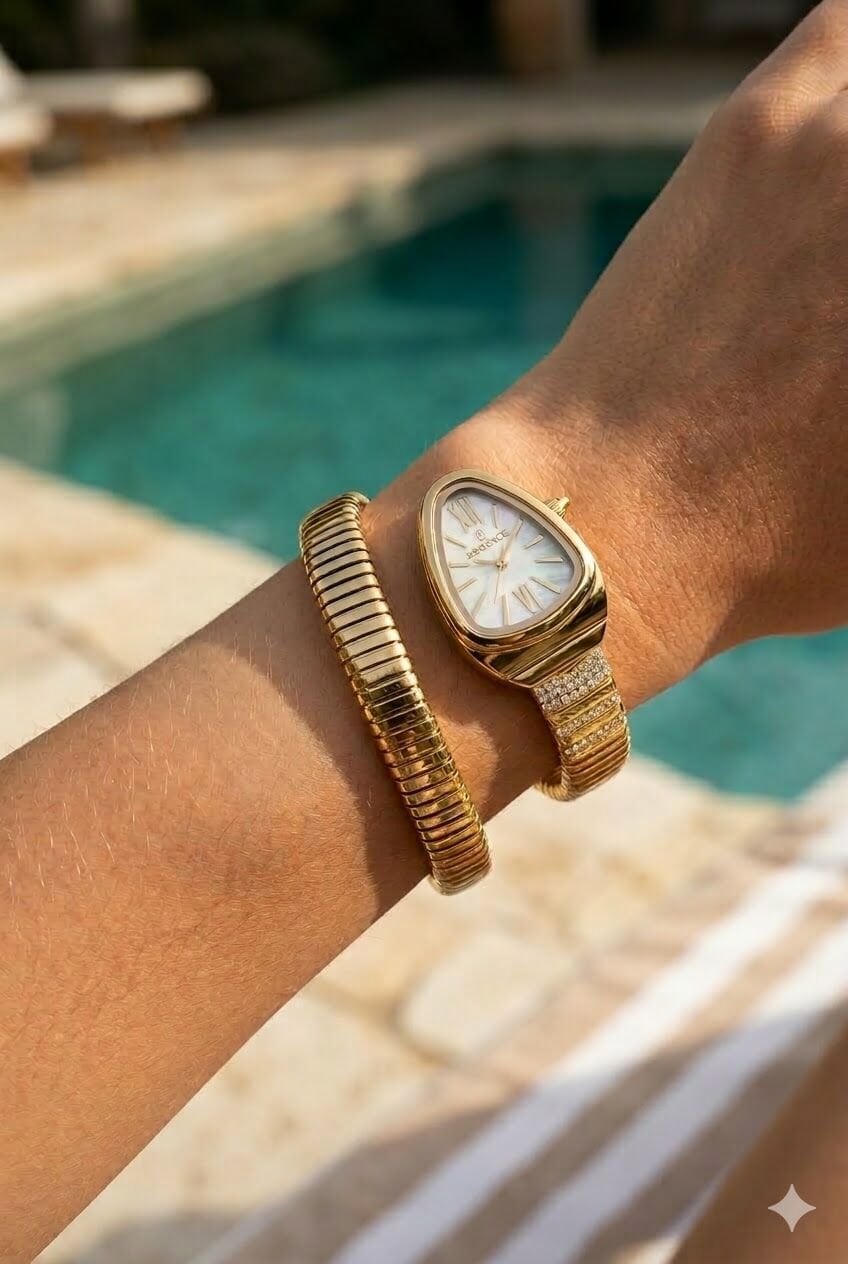 Essence kadın kol saati modern geometrik kasa yapısı ve zarif altın tonlarıyla öne çıkar. Sedef kadran detayı modele feminen ve şık bir görünüm kazandırır. Günlük kombinlerde rahatlıkla kullanılabilen Essence kadın kol saati, aynı zamanda özel günlerde de zarif bir tamamlayıcı olur.Kasa & Cam Yapısı