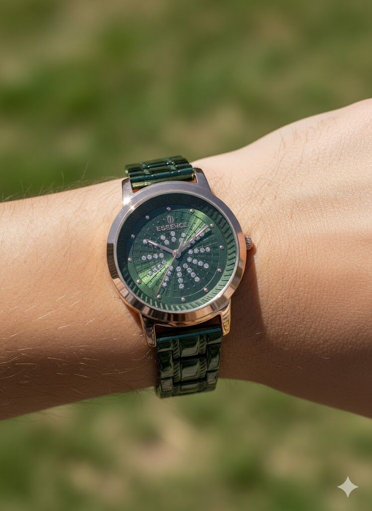 Essence kadın kol saati; 34 mm paslanmaz çelik kasası, yeşil tonlardaki kordonu ve taş detaylı yeşil kadran tasarımıyla zarif ve modern bir stil sunar. Bronz tonlu kasa rengiyle öne çıkan bu model, günlük kombinlere şık bir dokunuş katar.