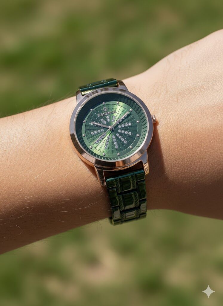 Yeşil kadran üzerinde yer alan taş detaylar, saate feminen ve dikkat çekici bir görünüm kazandırır. Bronz tonlu kasa ile uyumlu yeşil kordon, modern ve sofistike bir stil oluşturur.
