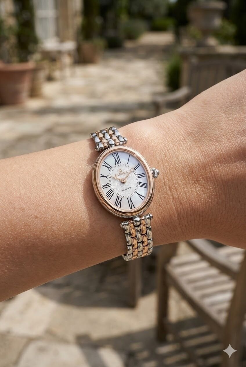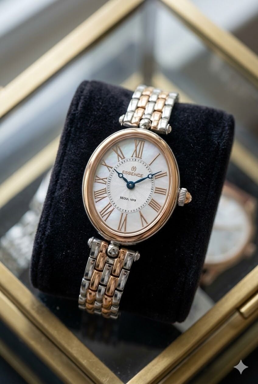 Essence kadın kol saati silver ve rose gold tonlarını bir araya getiren zarif tasarımıyla dikkat çeker. Oval kasa formu ve beyaz kadran detayı modele klasik ve feminen bir görünüm kazandırır. Günlük kullanımda rahatlıkla tercih edilebilen bu model, özel gün kombinlerinde de şık bir tamamlayıcı olarak öne çıkar.