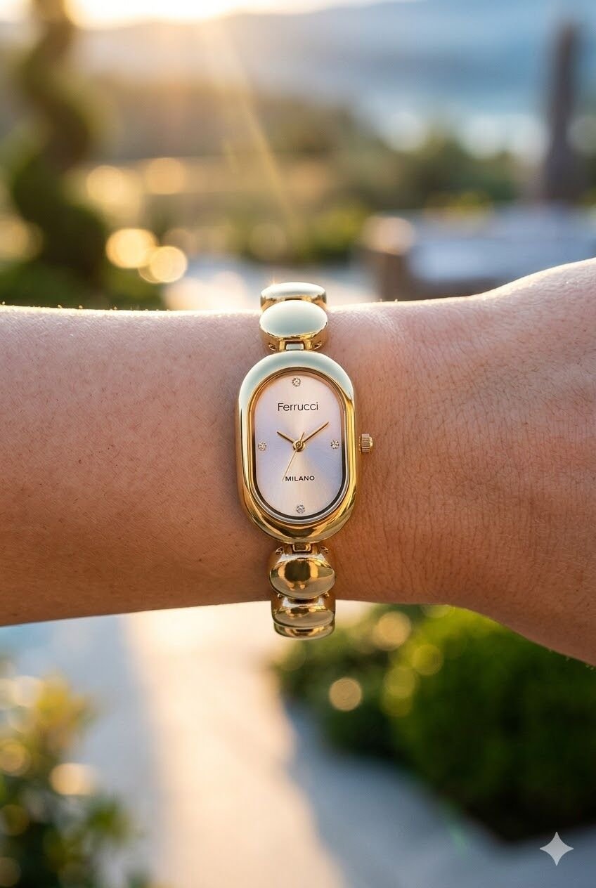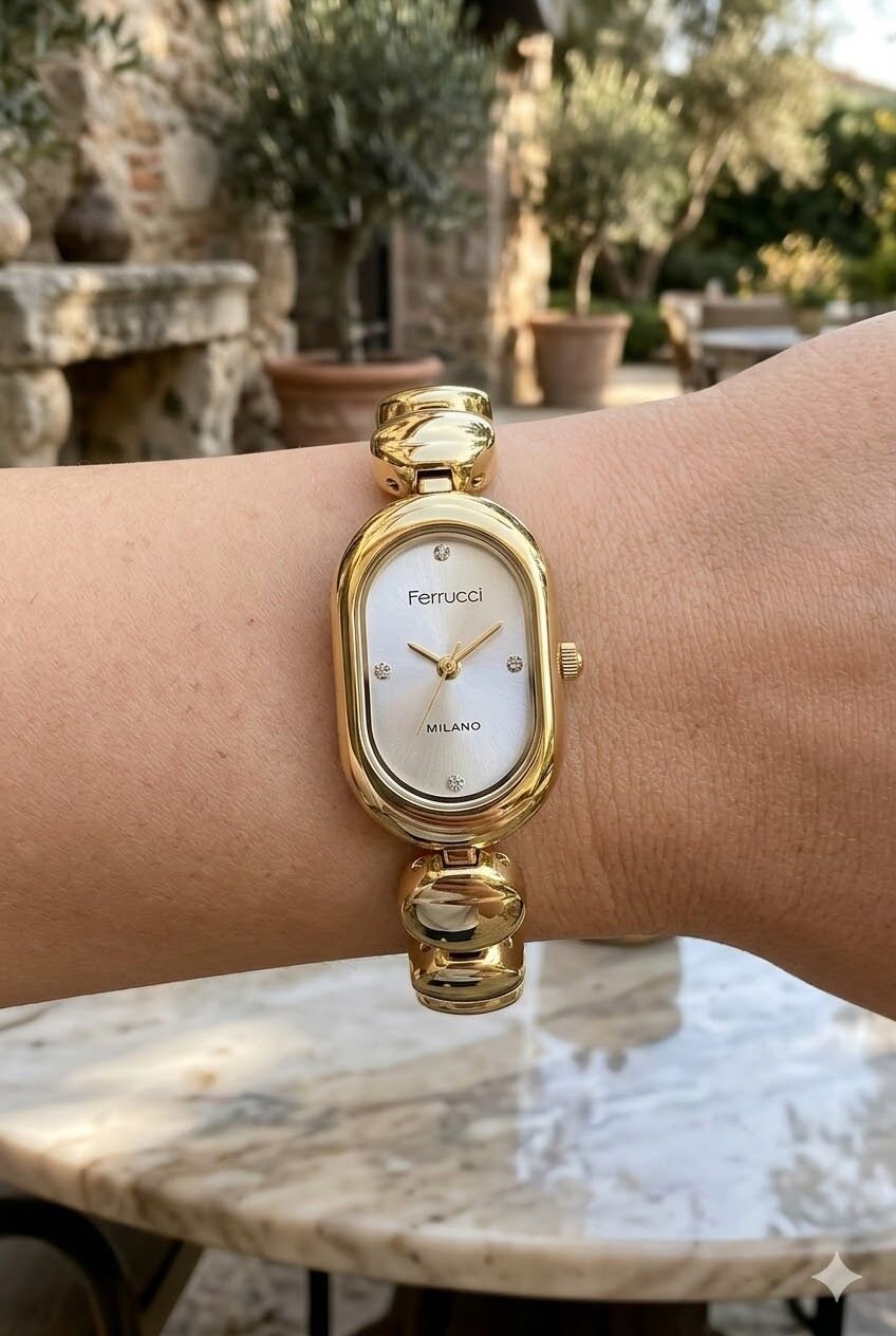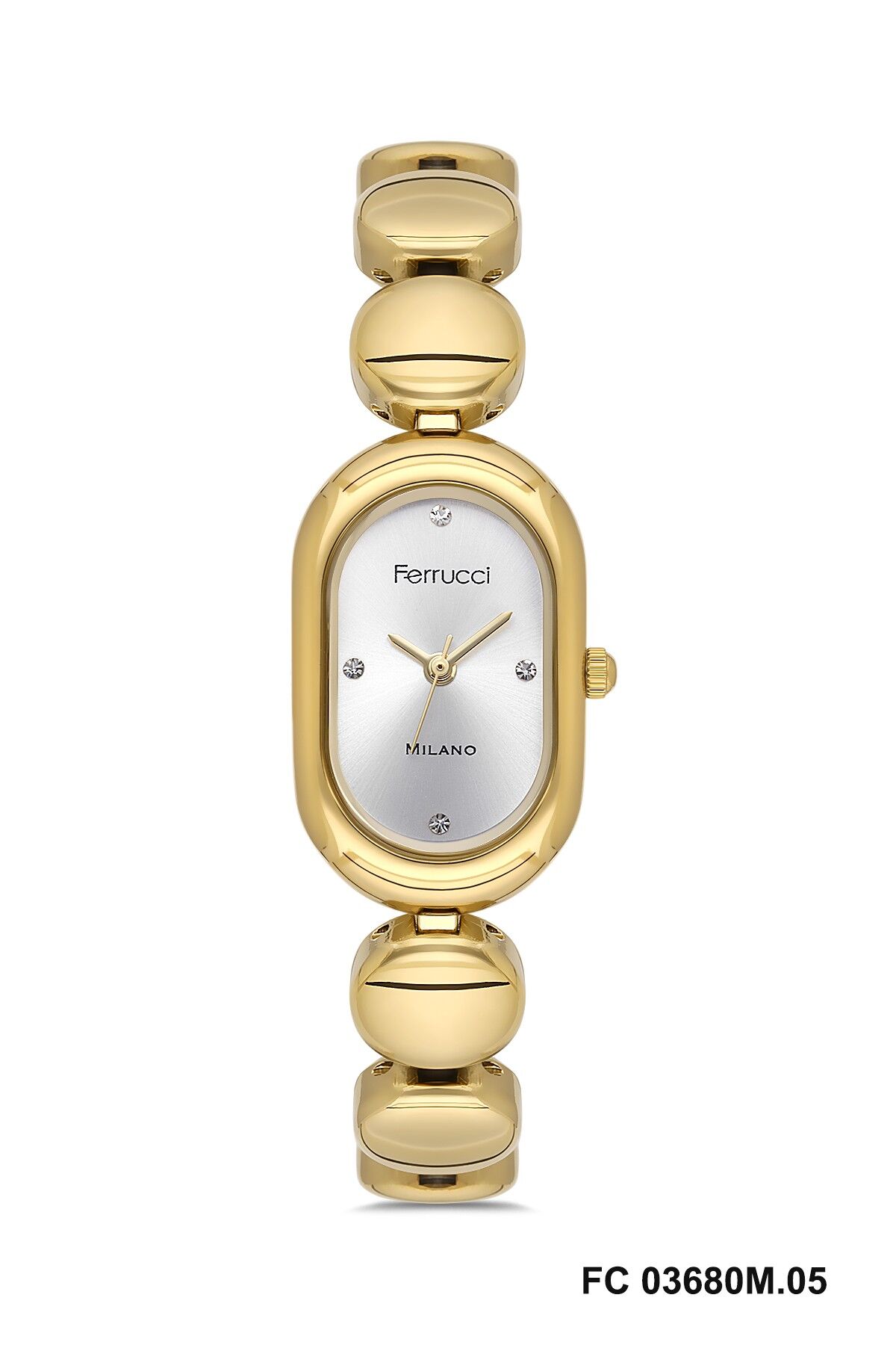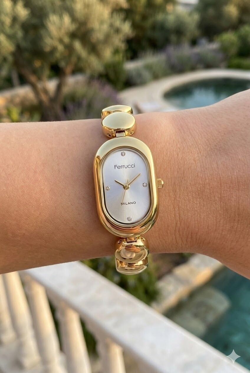 Ferrucci Milano çizgisini yansıtan bu model, oval hatlara sahip zarif kasa formu ve parlak altın tonlarıyla öne çıkar. Gümüş kadran üzerindeki taş detayları saate feminen ve şık bir karakter kazandırır. Günlük şıklıkta ve özel anlarda rahatlıkla tercih edilebilecek bir tasarım sunar.