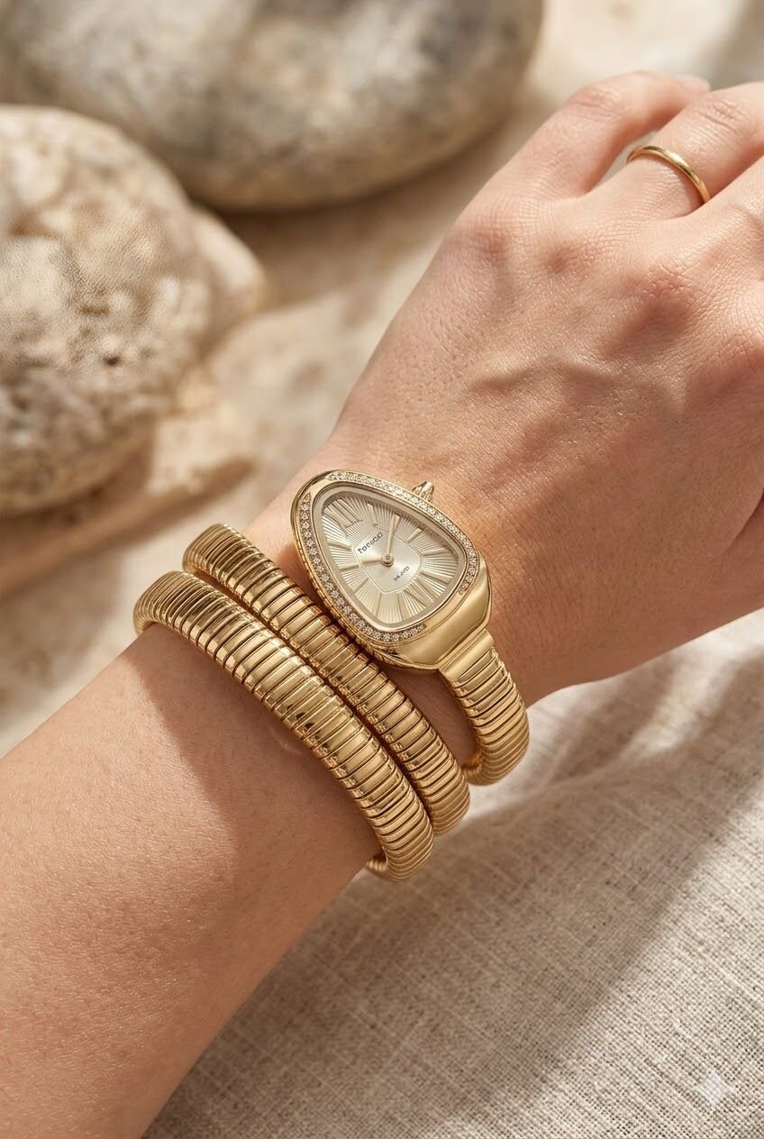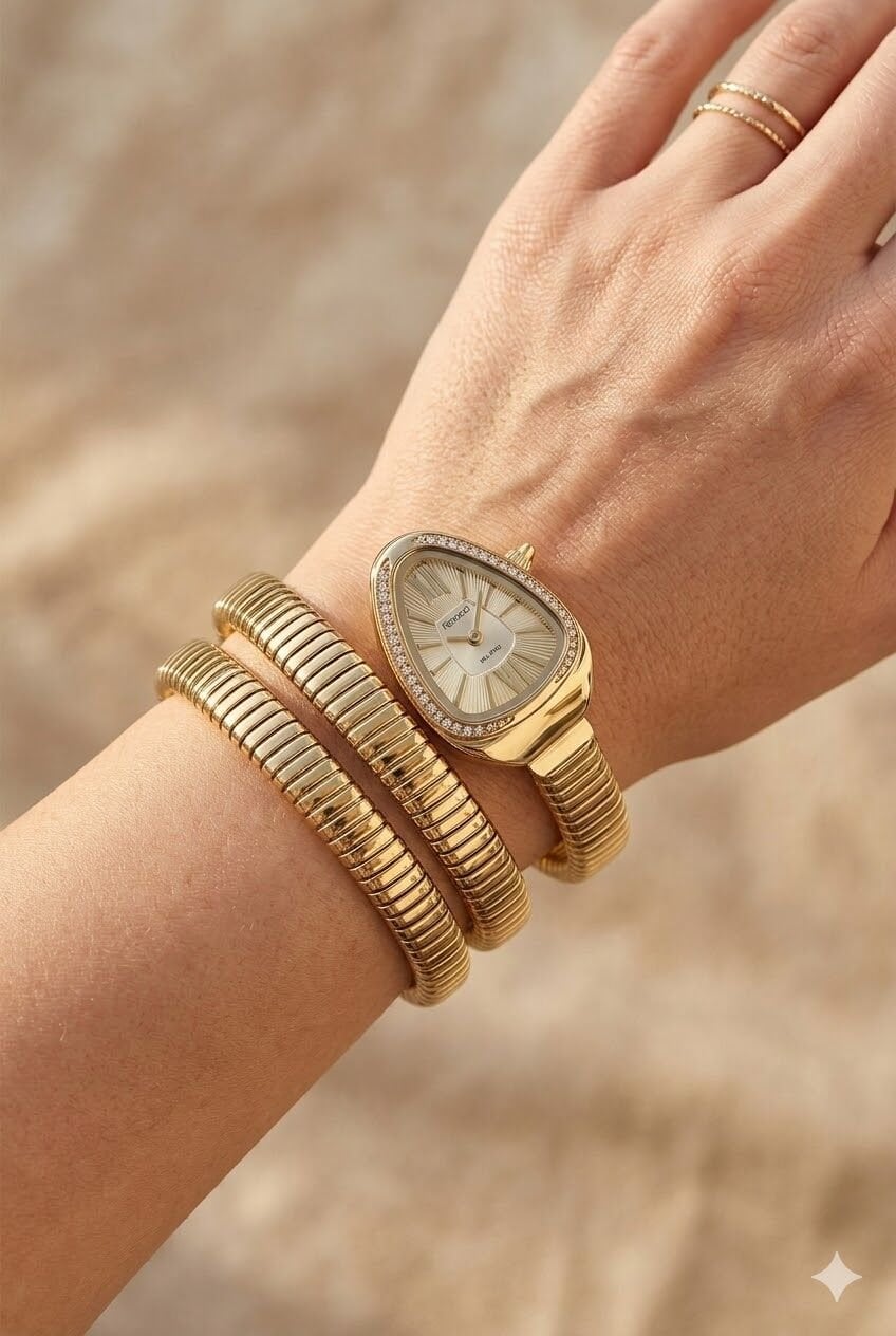 Ferrucci kadın kol saati damla formdaki zarif kasa yapısı ve altın tonların bütünlüğüyle oldukça şık bir görünüm sunar. Kasa çevresindeki taş detayları modele dikkat çekici ve feminen bir karakter kazandırırken bilezik formundaki kordon tasarımı saatin stilini daha özel hale getirir. Günlük kullanımda ve özel gün kombinlerinde rahatlıkla tercih edilebilecek etkileyici bir tasarıma sahiptir.