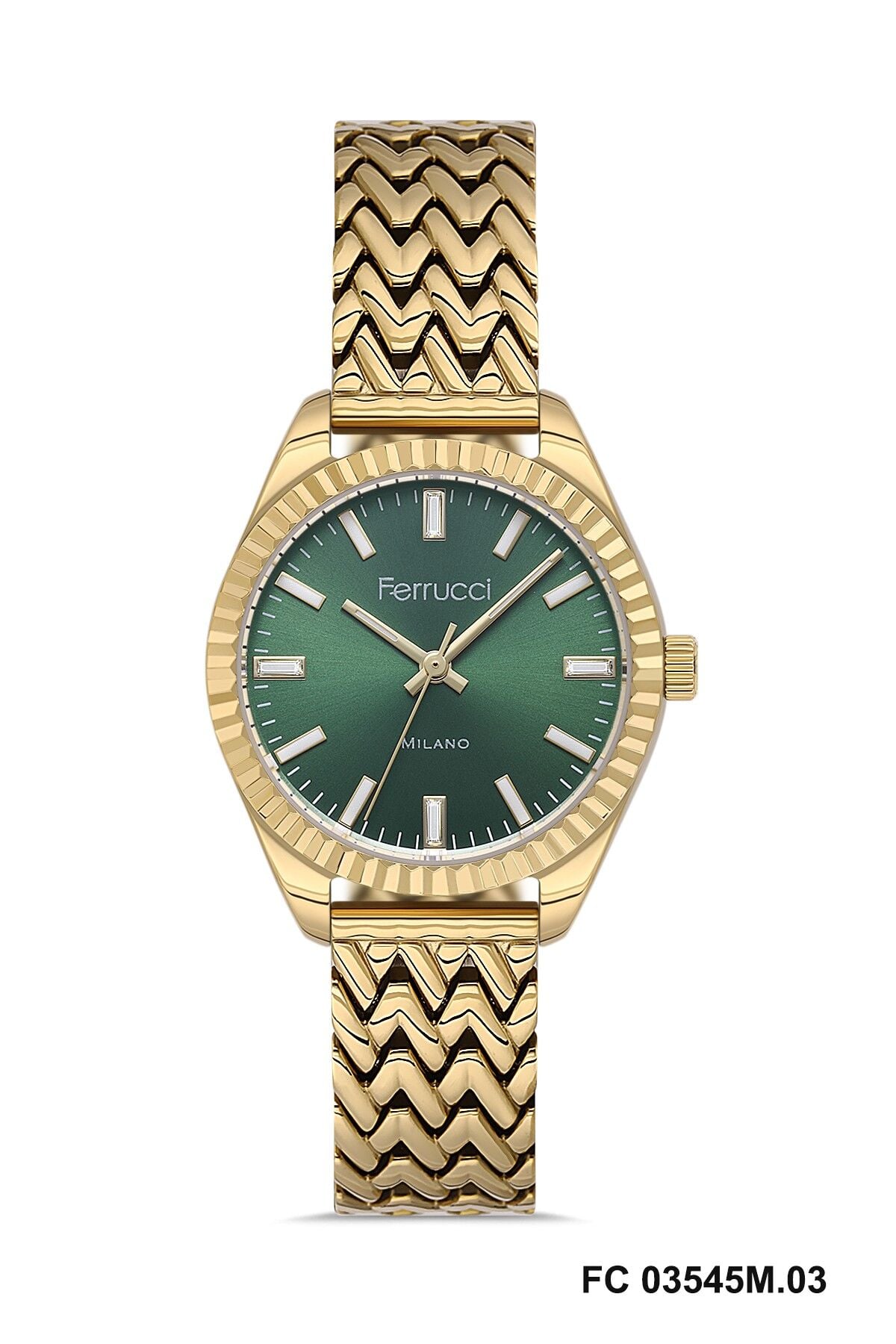 Ferrucci kadın kol saati yuvarlak kasa formu ve altın tonların uyumuyla zarif ve modern bir görünüm sunar. Yeşil kadran detayı modele canlı ve dikkat çekici bir karakter kazandırırken, desenli metal kordon tasarımı saatin stilini daha güçlü hale getirir. Günlük kullanımda ve özel gün kombinlerinde rahatlıkla tercih edilebilecek şık bir tasarıma sahiptir.