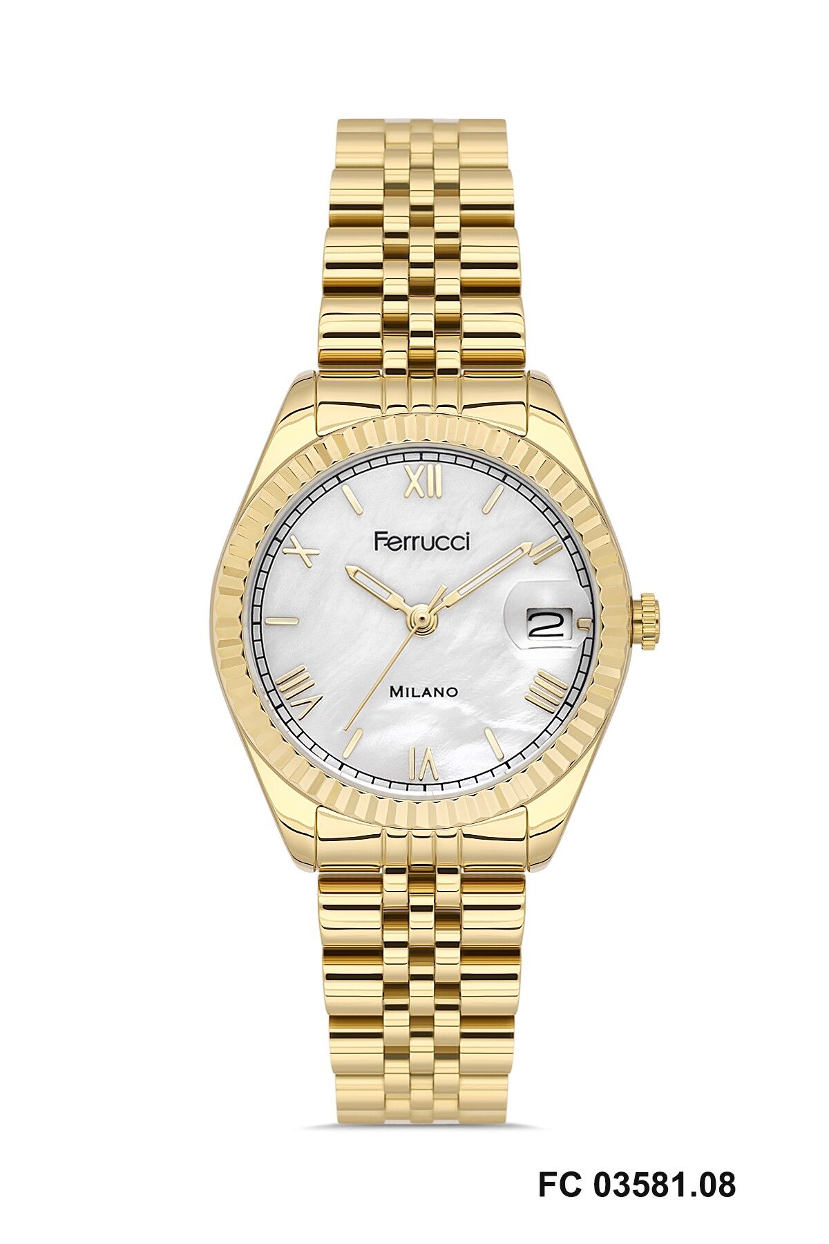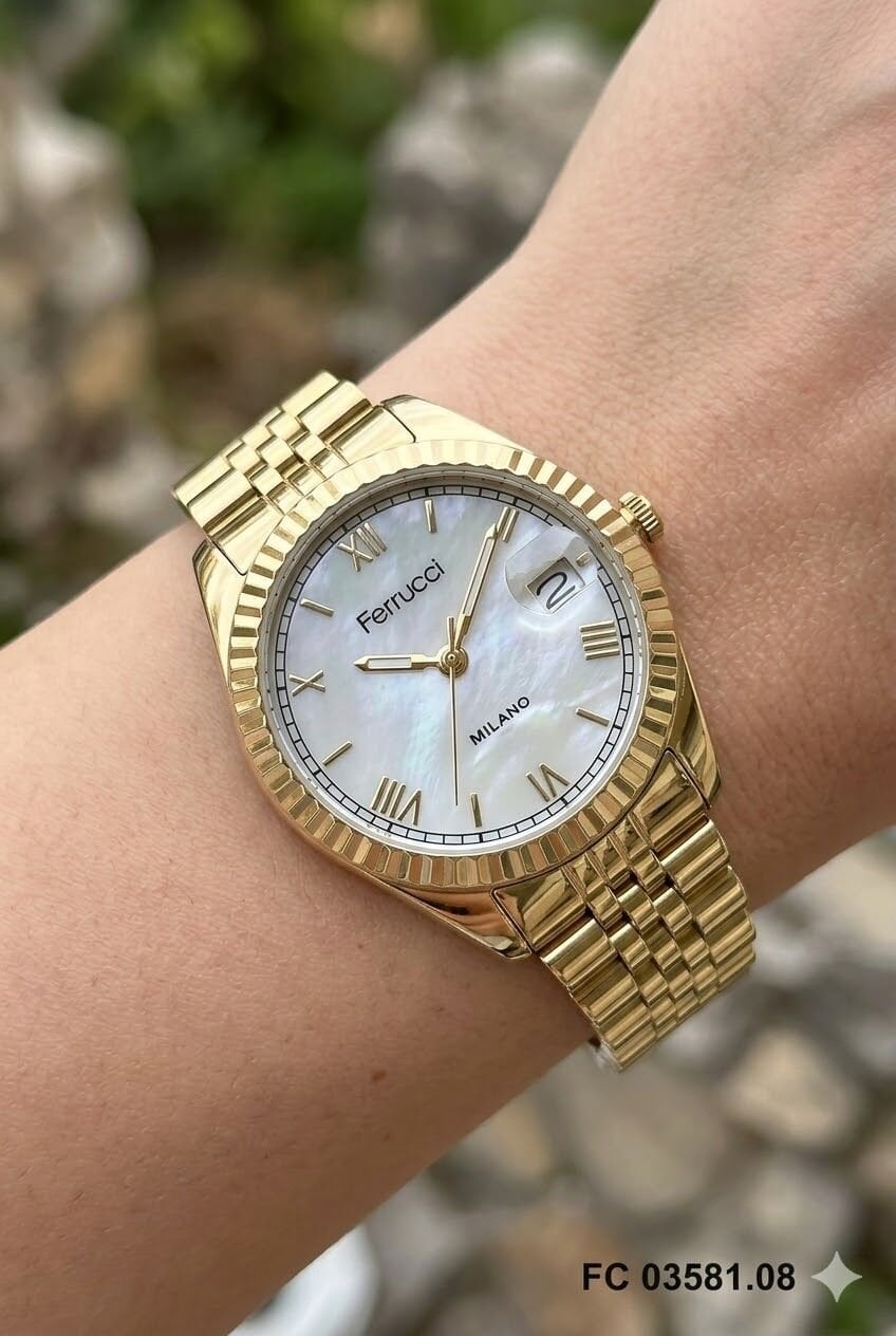Altın renkli metal kordon saatin genel tasarımını tamamlayan zarif bir görünüm sunar. Bileğe uyum sağlayan yapısı sayesinde Ferrucci kadın kol saati gün boyu konforlu kullanım sağlar.