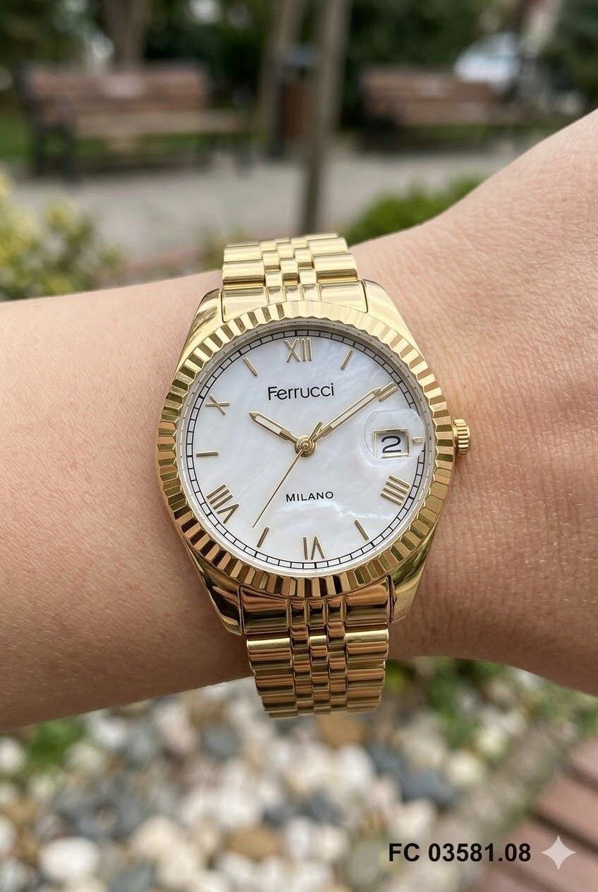 Ferrucci kadın kol saati yuvarlak kasa formu ve altın tonların uyumuyla zarif ve modern bir görünüm sunar. Beyaz kadran detayı modele sade ve şık bir karakter kazandırırken takvim penceresi günlük kullanımda pratiklik sağlar. Günlük kombinlerde ve klasik stillerde rahatlıkla tercih edilebilecek estetik bir tasarıma sahiptir.