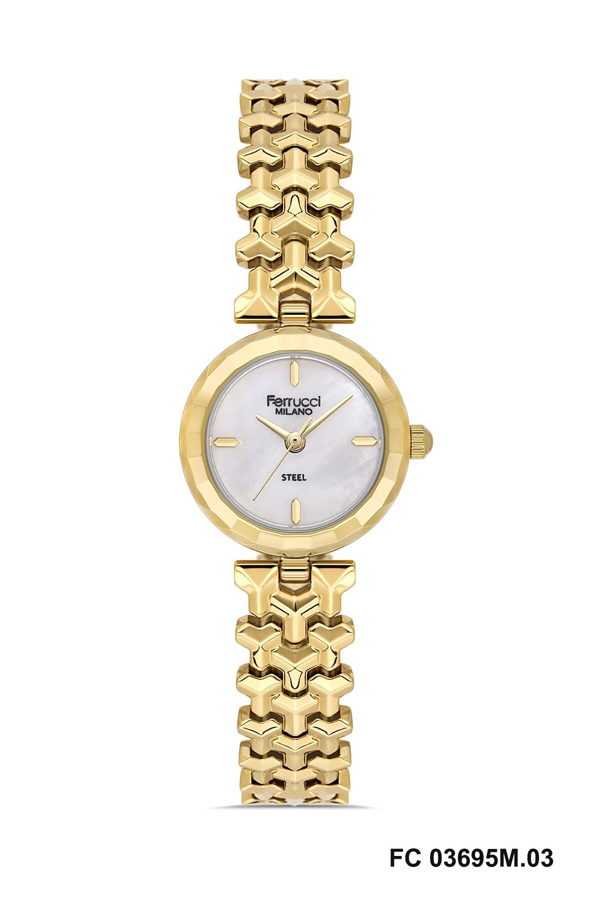Altın renkli metal kordon saatin genel tasarımını tamamlayan şık ve dikkat çekici bir görünüm sunar. Bileğe uyum sağlayan yapısı sayesinde Ferrucci kadın kol saati gün boyu konforlu kullanım sağlar.