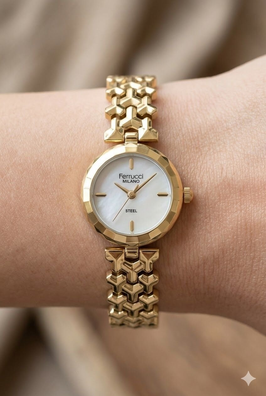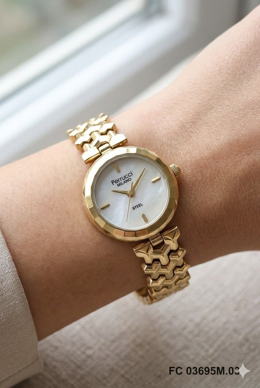 Ferrucci kadın kol saati zarif tasarımı ve modern detaylarıyla günlük kullanımda dikkat çeken özel bir modeldir. Altın tonlu yuvarlak kasa ve metal kordon yapısı sayesinde bilekte şık ve feminen bir duruş sunar. Ferrucci kadın kol saati arayanlar için hem kullanışlı hem de estetik bir seçenek oluşturan bu model, gümüş kadranı ile klasik görünümü daha zarif hale getirir. 26 mm kasa çapına sahip olan bu model, ince ve şık saat tercih eden kadınlar için ideal bir seçimdir.