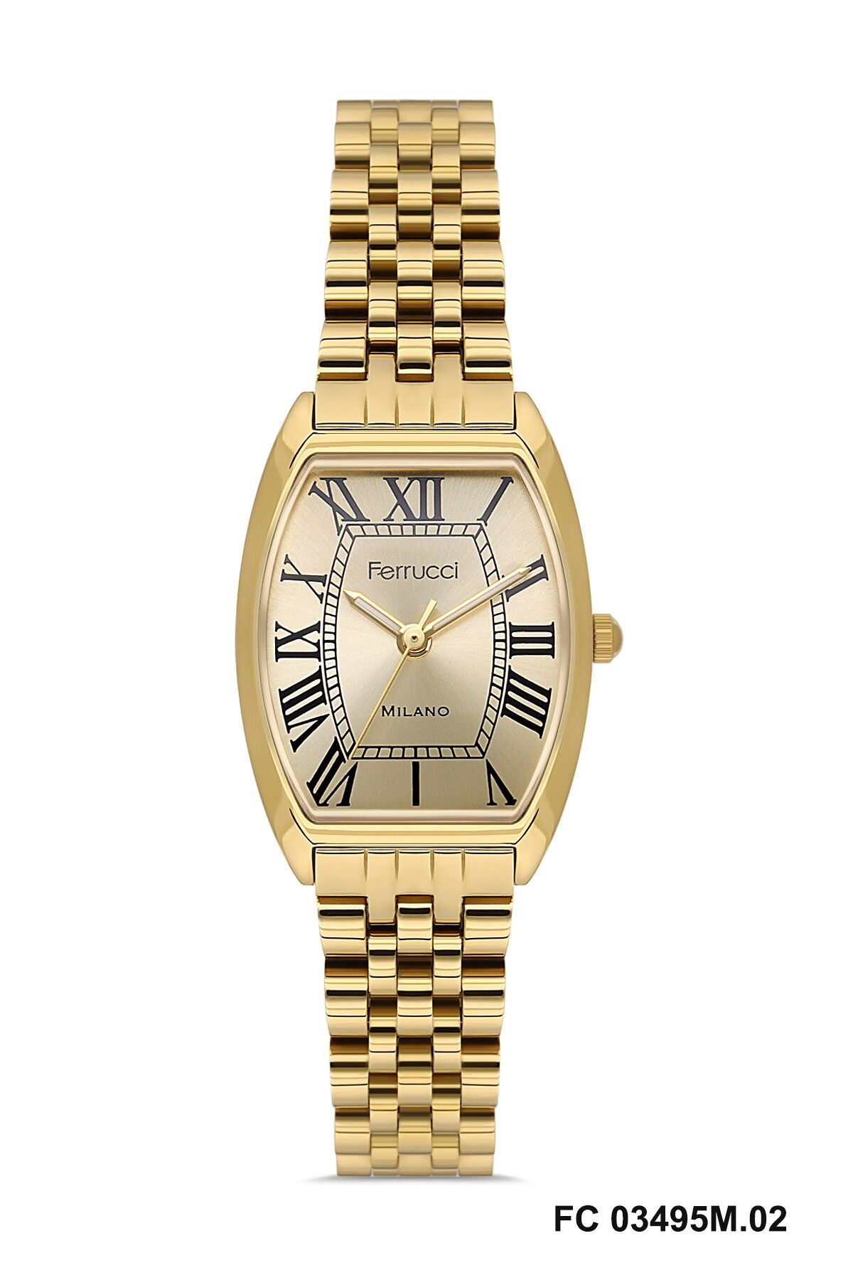 Altın renkli metal kordon saatin genel tasarımını tamamlayan modern ve zarif bir görünüm sunar. Bileğe uyum sağlayan yapısı sayesinde Ferrucci kadın kol saati gün boyu konforlu kullanım sağlar.