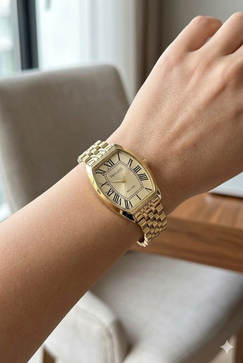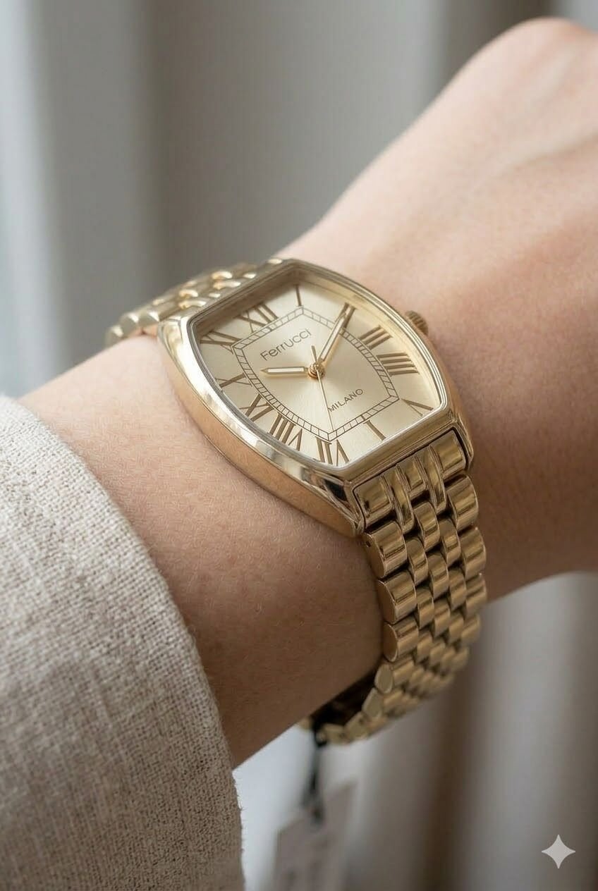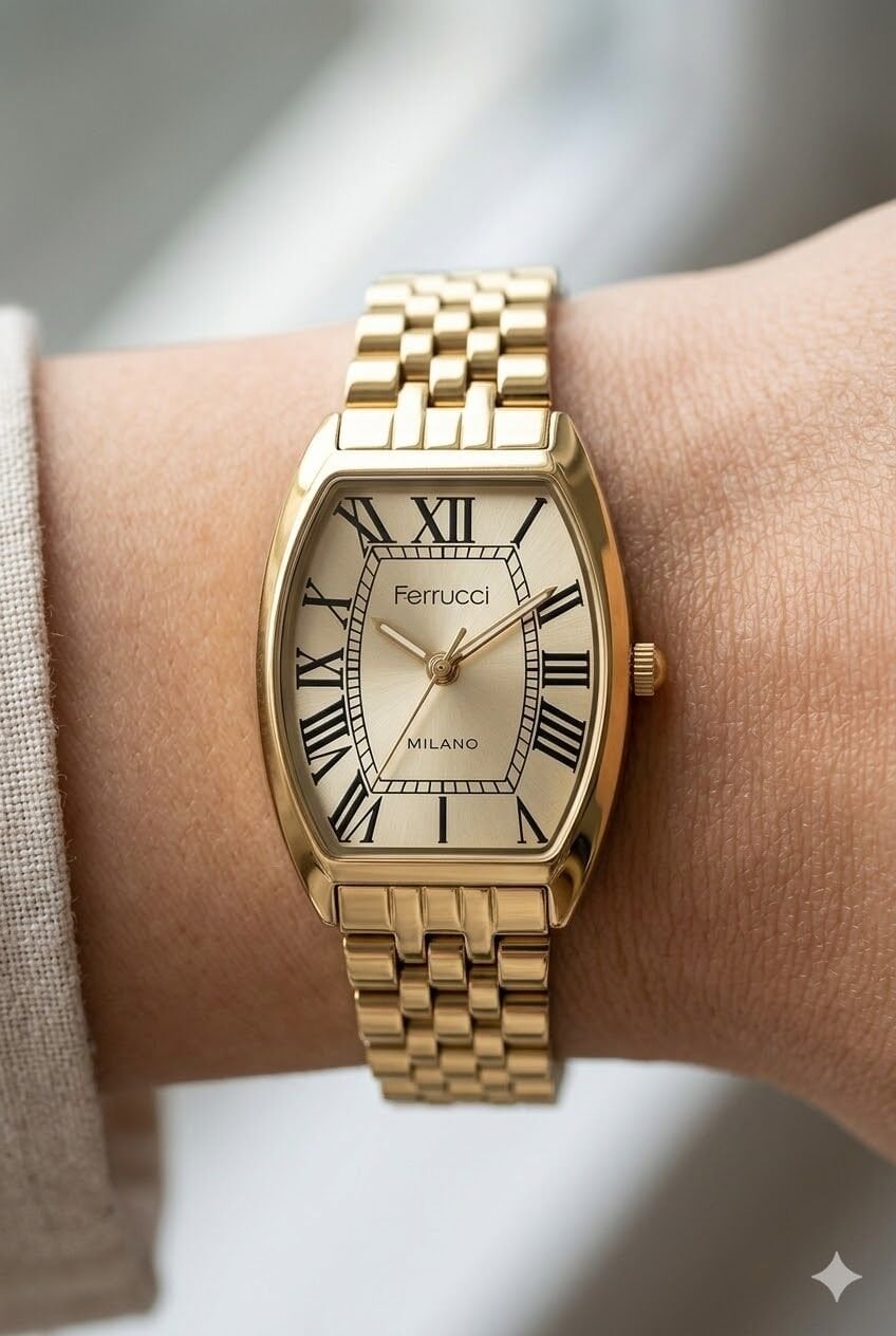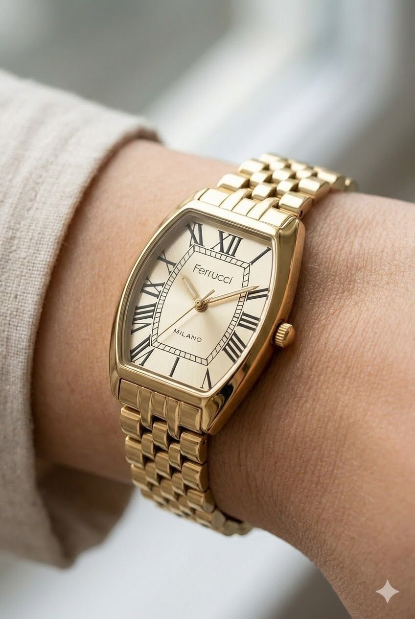 Ferrucci kadın kol saati zarif tasarımı ve modern detaylarıyla günlük kullanımda dikkat çeken özel bir modeldir. Altın tonlu dikdörtgen kasa ve metal kordon yapısı sayesinde bilekte şık ve feminen bir duruş sunar. Ferrucci kadın kol saati arayanlar için hem kullanışlı hem de estetik bir seçenek oluşturan bu model, altın kadranı ile klasik görünümü daha zarif ve dikkat çekici hale getirir. 28 mm kasa çapına sahip olan bu model, ince ve şık saat tercih eden kadınlar için ideal bir seçimdir.