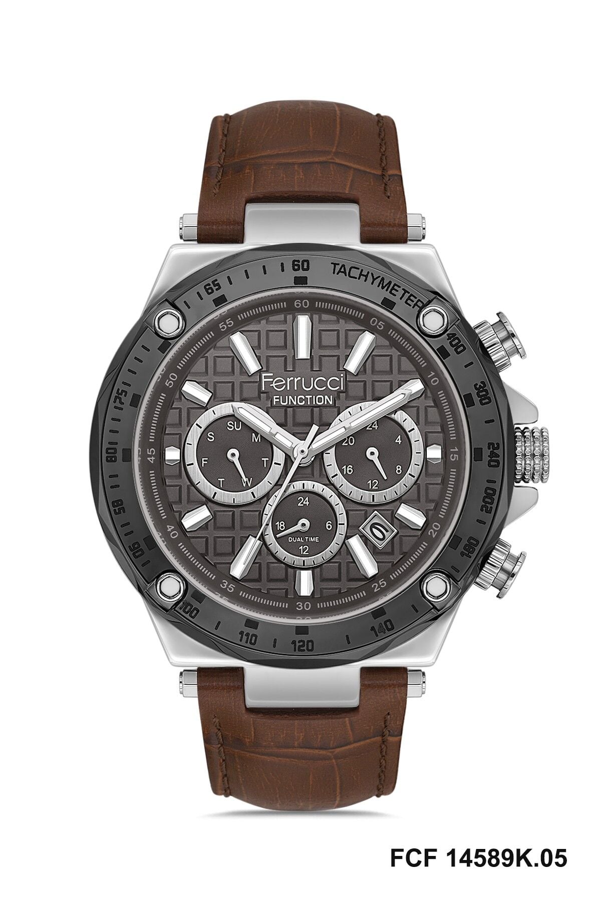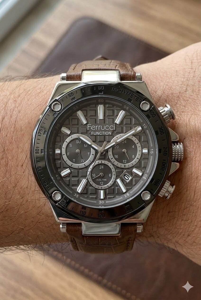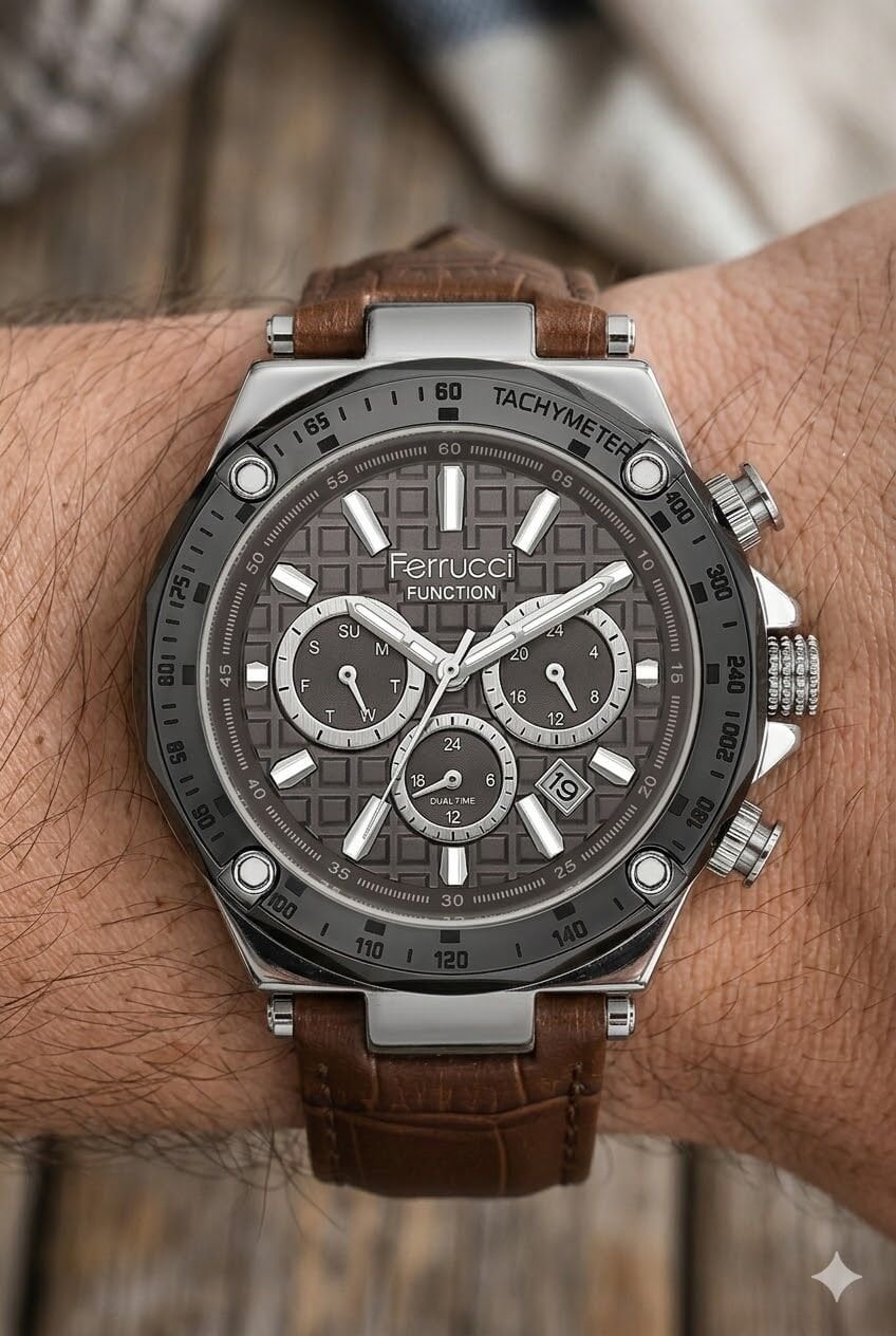 Ferrucci erkek kol saati yuvarlak kasa formu ve gümüş titanyum tonların güçlü uyumuyla dikkat çekici bir görünüm sunar. Çok fonksiyonlu kadran yapısı modele dinamik bir karakter kazandırırken desenli gri kadran tasarımı saate modern ve özgün bir stil katar. Açık kahverengi deri kayış ile tamamlanan bu model, günlük kullanımda ve özel kombinlerde rahatlıkla tercih edilebilecek iddialı bir tasarıma sahiptir.