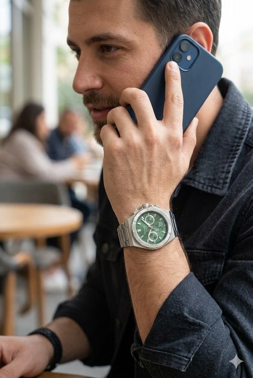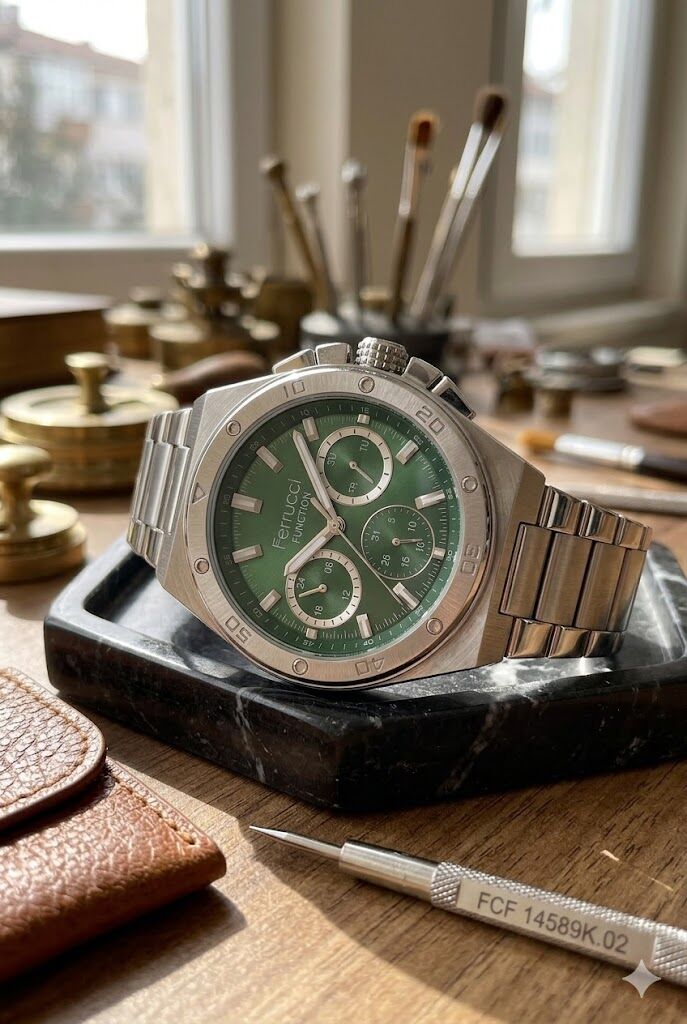 Ferrucci erkek kol saati yuvarlak kasa formu ve gümüş tonların güçlü uyumuyla dikkat çekici bir görünüm sunar. Çok fonksiyonlu kadran yapısı modele dinamik bir karakter kazandırırken yeşil kadran detayı saate sportif ve modern bir stil katar. Günlük kullanımda ve güçlü kombinlerde rahatlıkla tercih edilebilecek iddialı bir tasarıma sahiptir.