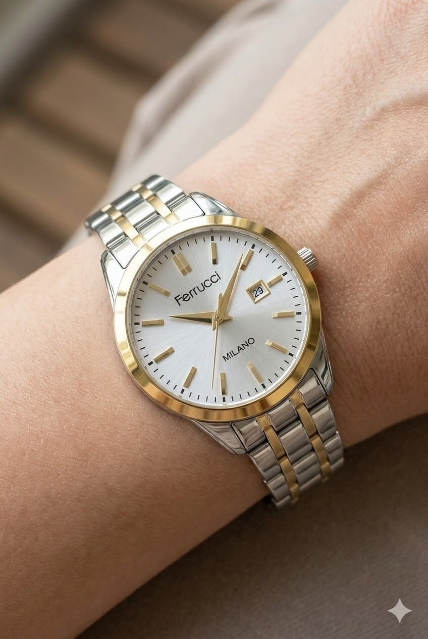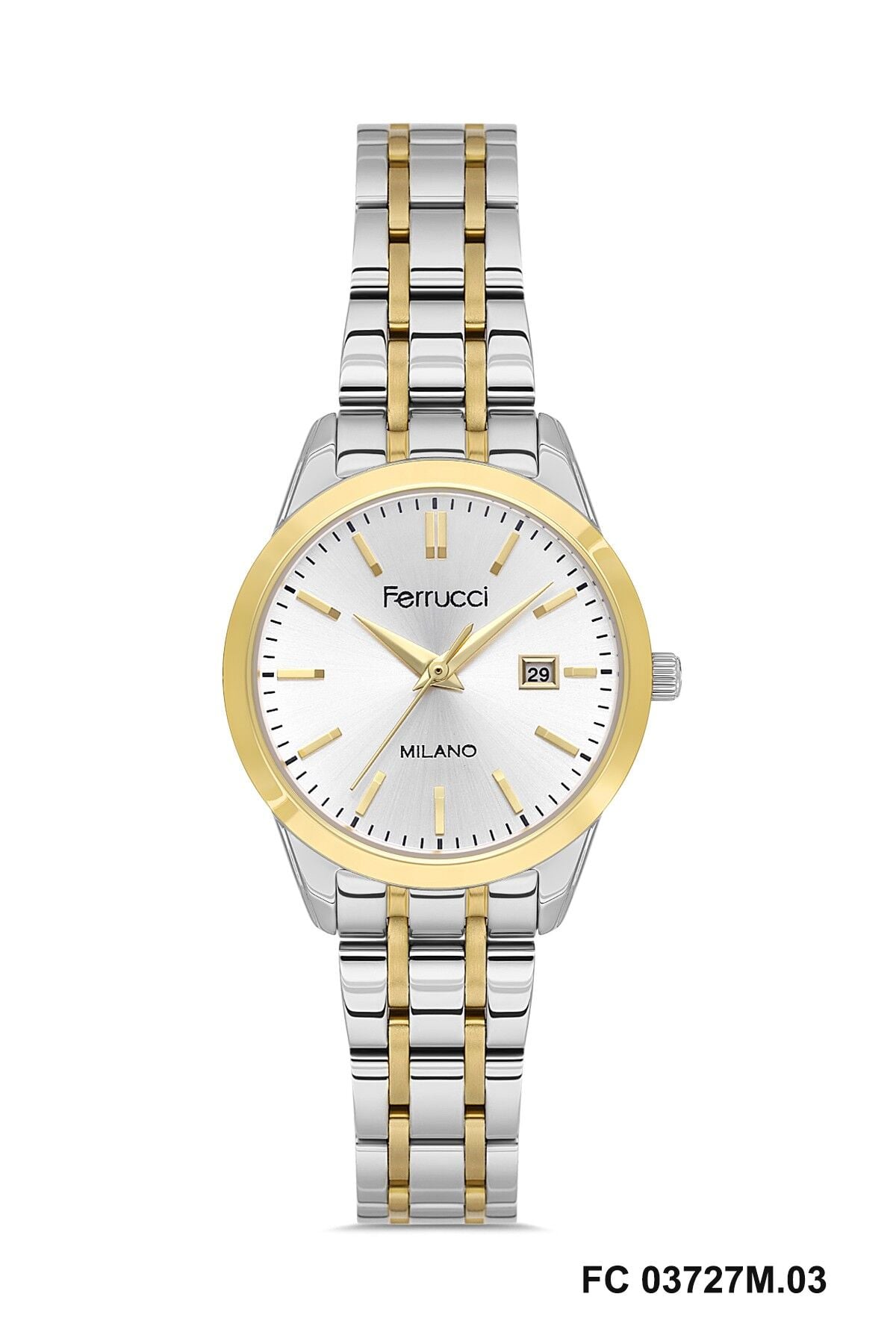 Altın ve gümüş renkli metal kordon saatin genel tasarımını tamamlayan modern bir görünüm sunar. Bileğe uyum sağlayan yapısı sayesinde Ferrucci kadın kol saati gün boyu konforlu kullanım sağlar.
