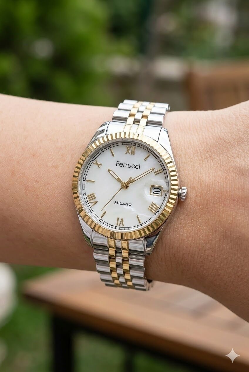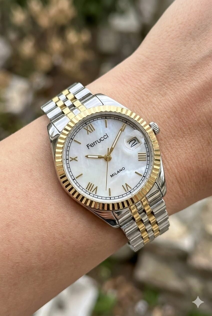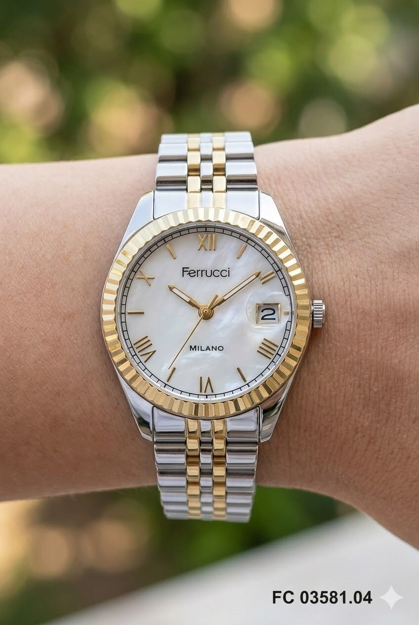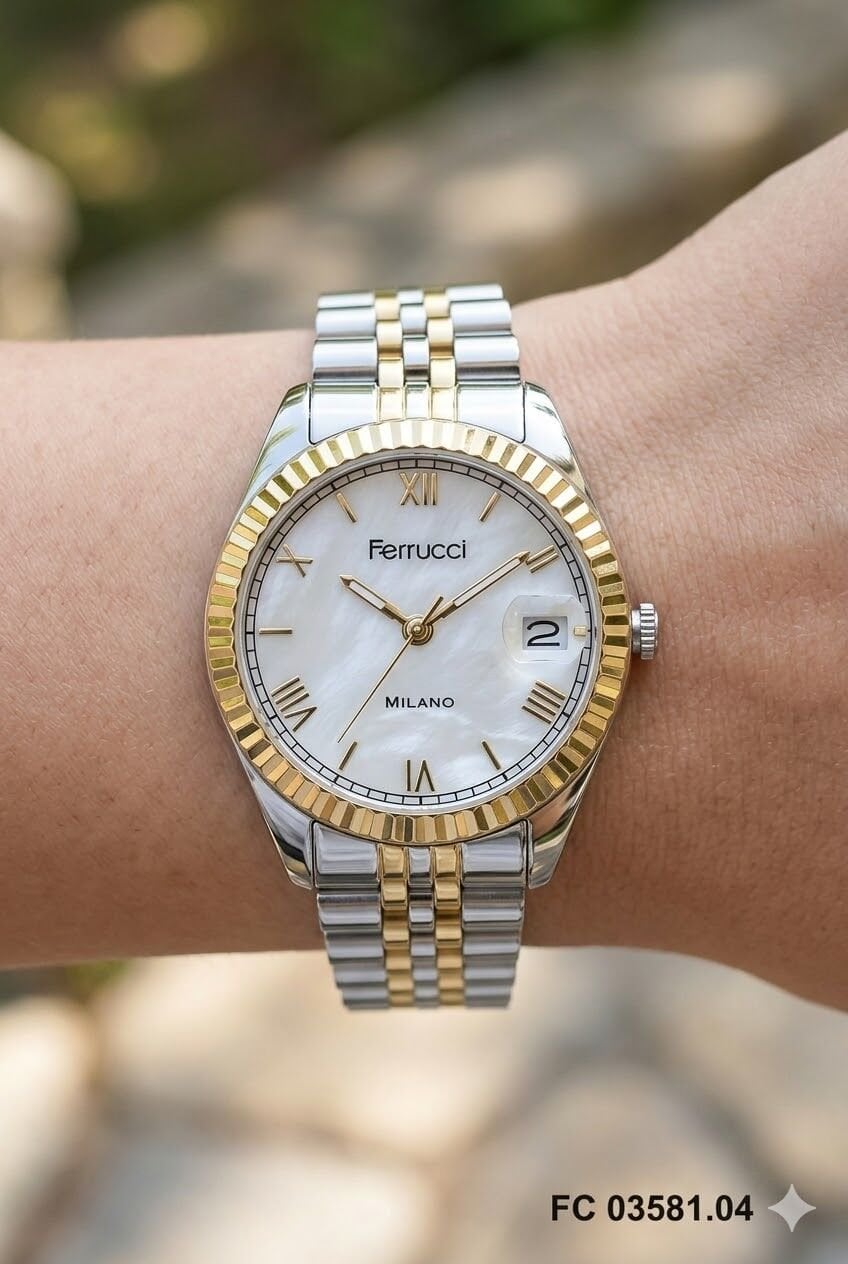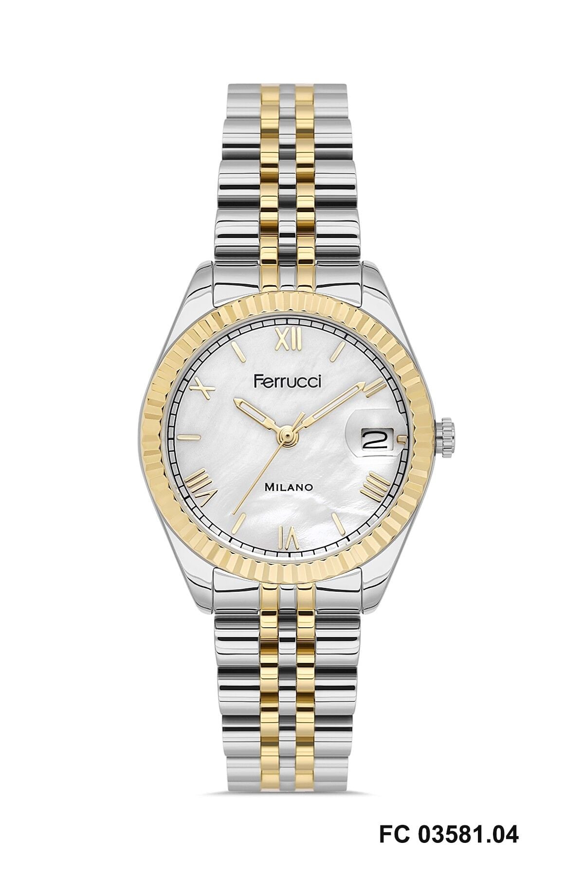 Altın ve gümüş renkli metal kordon saatin genel tasarımını tamamlayan zarif bir görünüm sunar. Bileğe uyum sağlayan yapısı sayesinde Ferrucci kadın kol saati gün boyu konforlu kullanım sağlar.