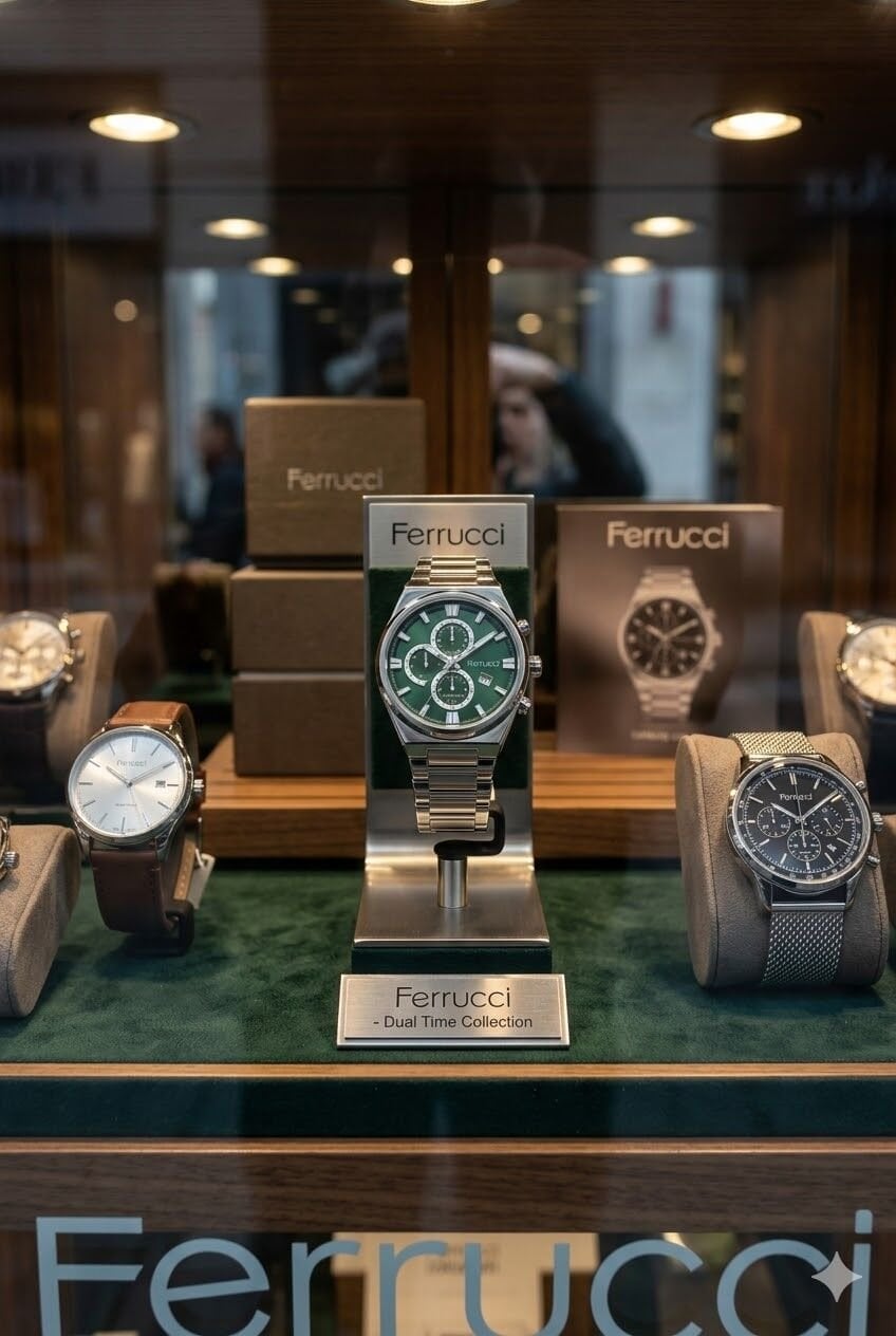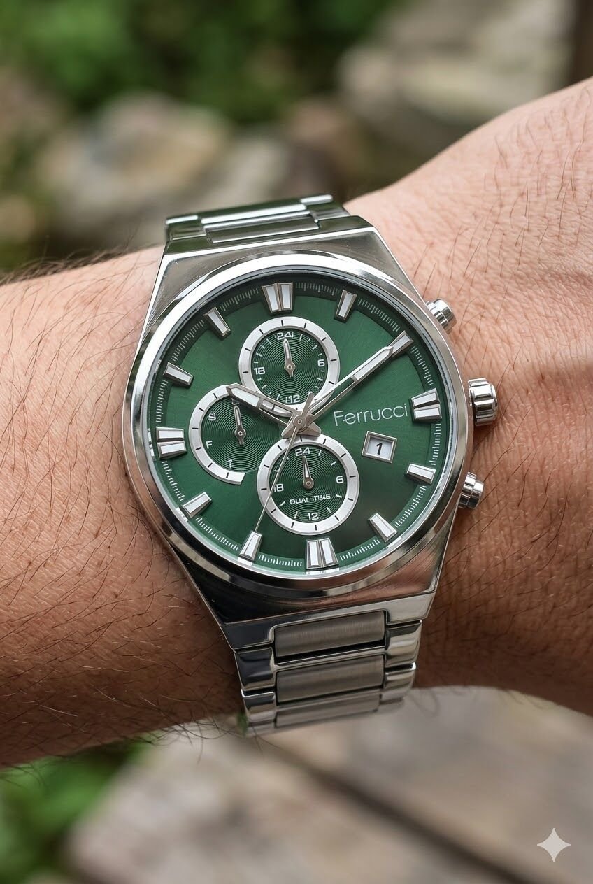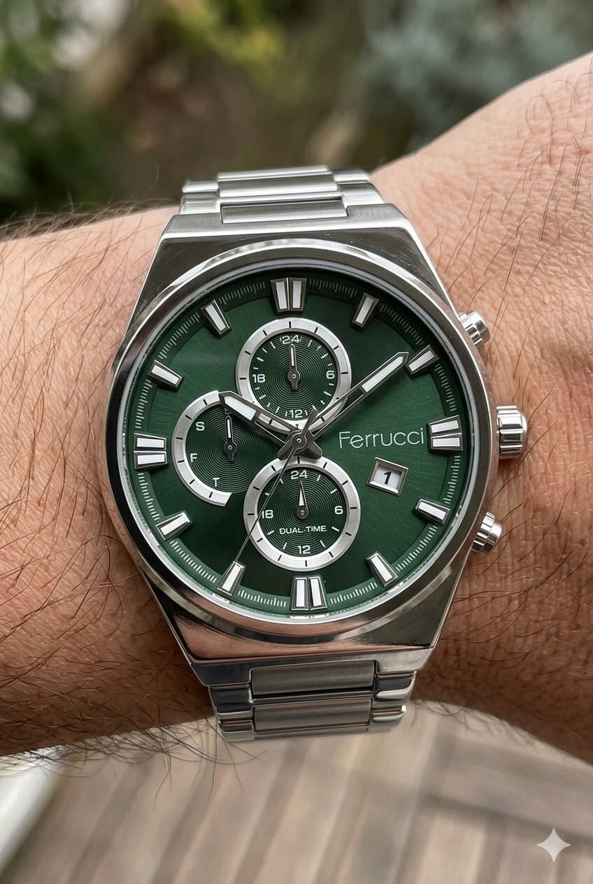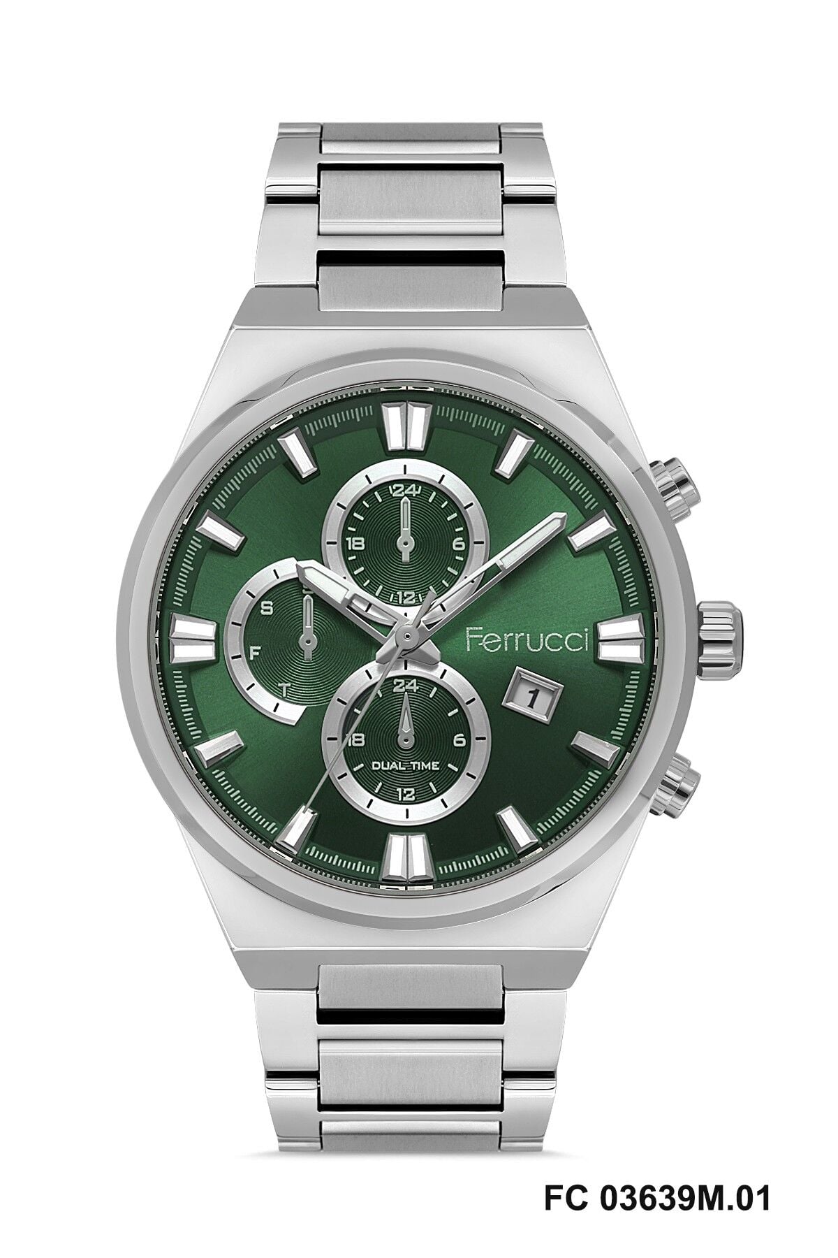 Ferrucci erkek kol saati güçlü tasarımı ve çok fonksiyonlu yapısıyla günlük kullanımda şıklık ve kullanışlılığı bir arada sunar. Gümüş tonlu kasa ve metal kordon yapısı sayesinde bilekte modern ve dengeli bir duruş sağlar. Ferrucci erkek kol saati arayanlar için hem estetik hem de işlevsel bir seçenek sunan bu model, yeşil kadranı ile sportif ve karakterli bir görünüm kazandırır. 40 mm kasa çapına sahip olan bu model, dikkat çekici ve modern saat tercih eden erkek kullanıcılar için ideal bir seçimdir.