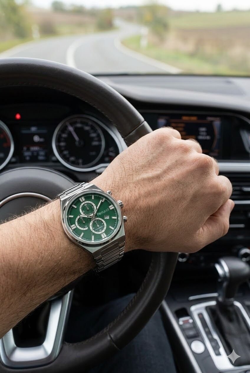 Ferrucci erkek kol saati yuvarlak kasa formu ve gümüş tonların modern uyumuyla güçlü bir görünüm sunar. Çok fonksiyonlu kadran yapısı modele dinamik bir karakter kazandırırken yeşil kadran detayı saate sportif ve dikkat çekici bir stil ekler. Günlük kullanımda ve özel kombinlerde rahatlıkla tercih edilebilecek şık bir tasarıma sahiptir.