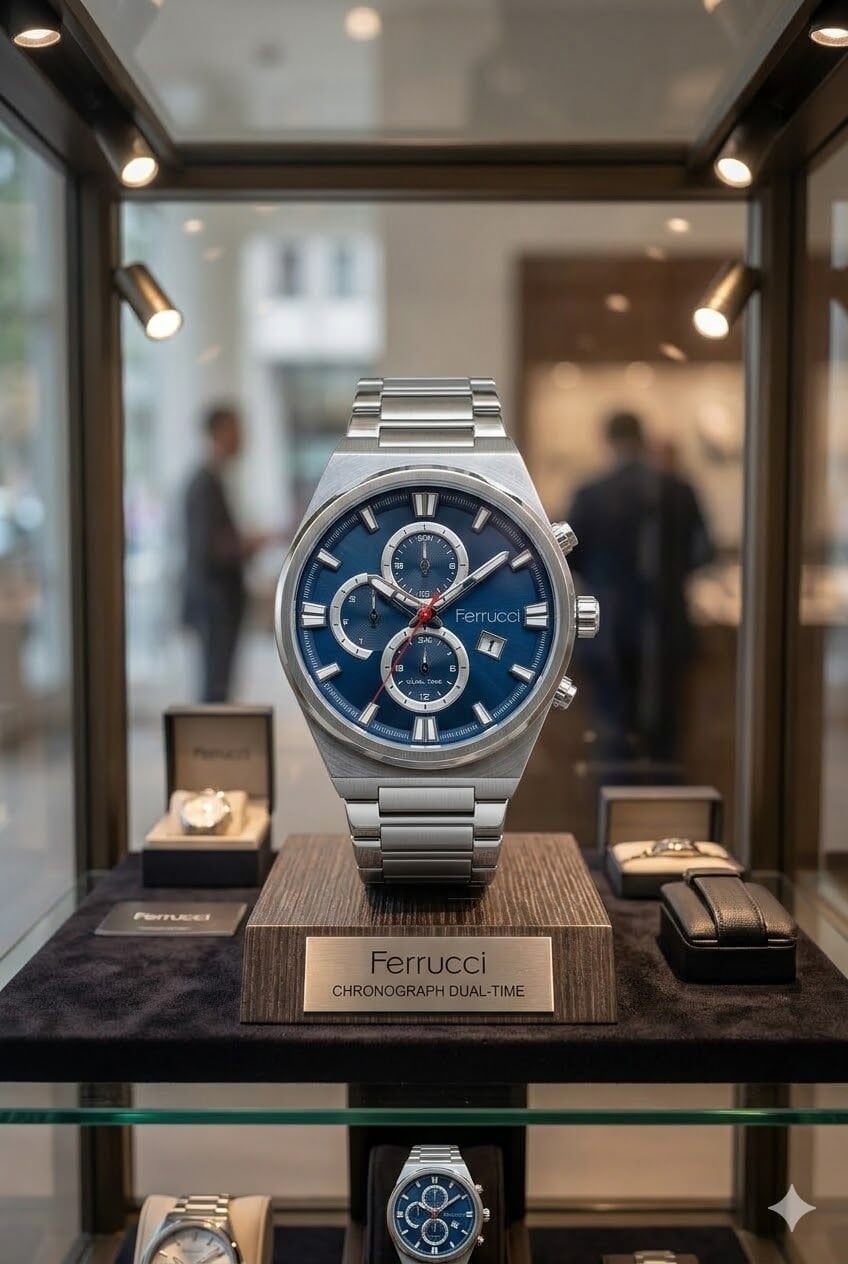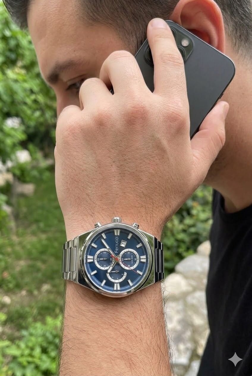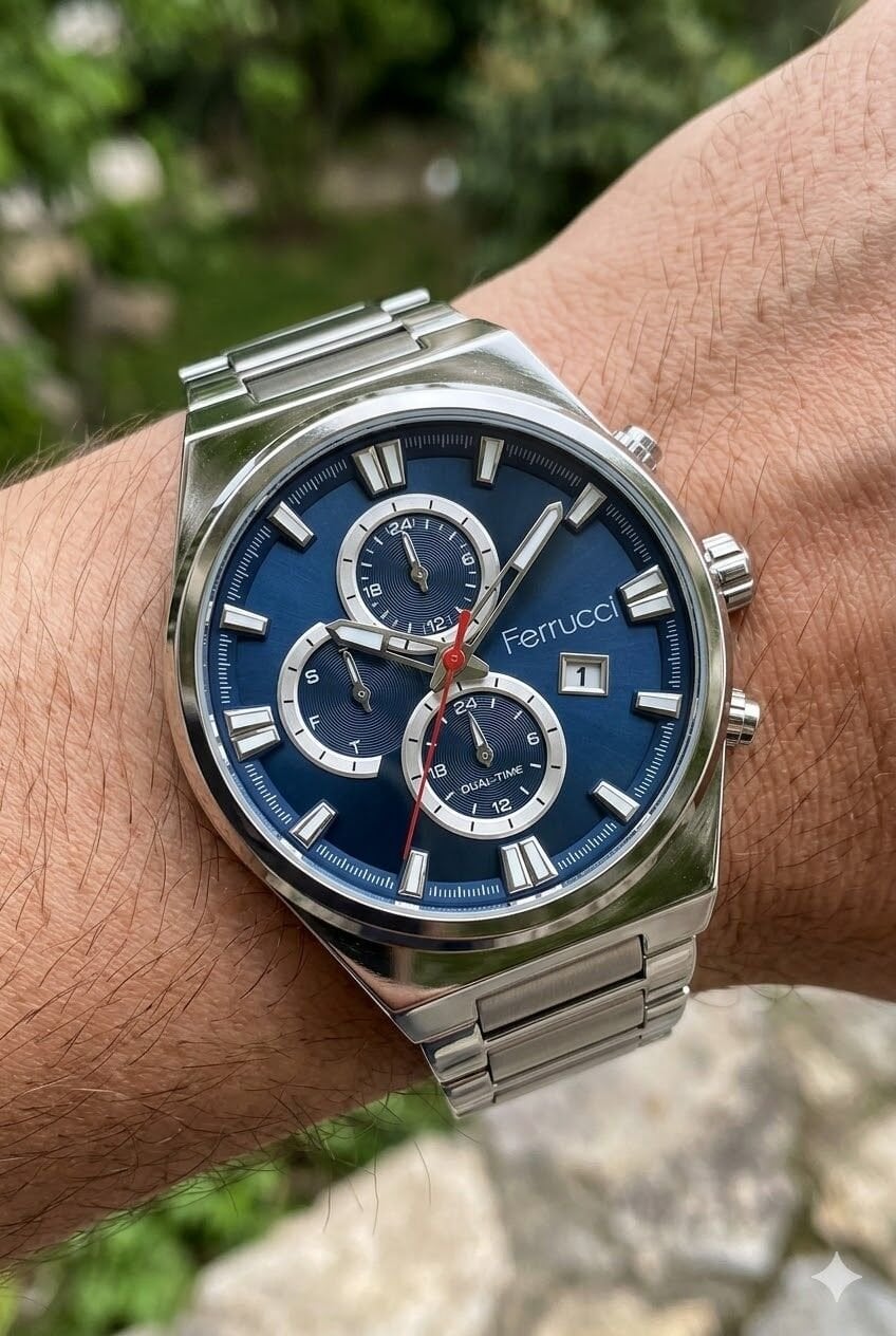 Ferrucci erkek kol saati yuvarlak kasa formu ve gümüş tonların modern uyumuyla güçlü bir görünüm sunar. Çok fonksiyonlu kadran yapısı modele dinamik bir karakter kazandırırken lacivert kadran detayı saate sportif ve dikkat çekici bir stil ekler. Günlük kullanımda ve özel kombinlerde rahatlıkla tercih edilebilecek şık bir tasarıma sahiptir.Kasa & Cam Yapısı