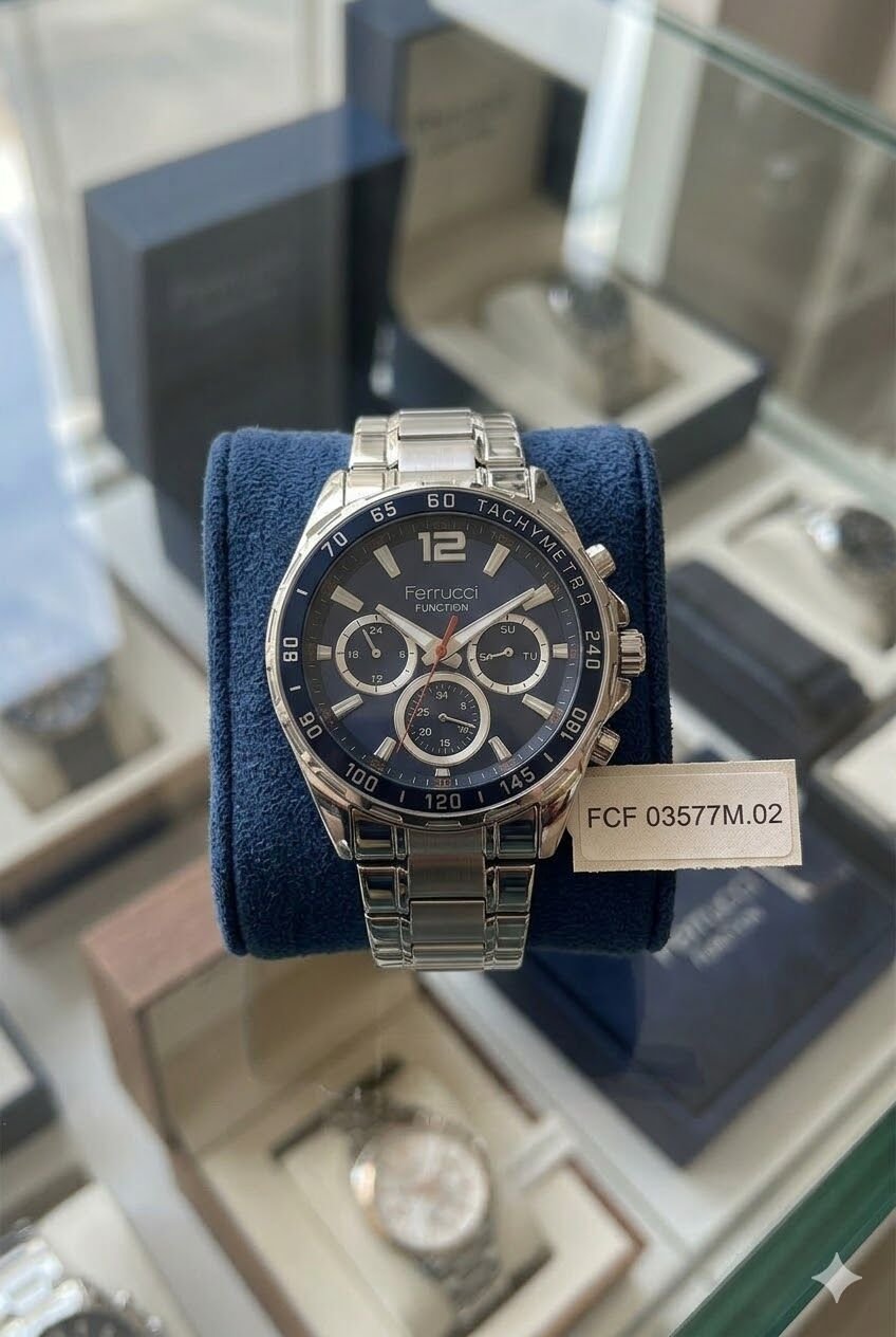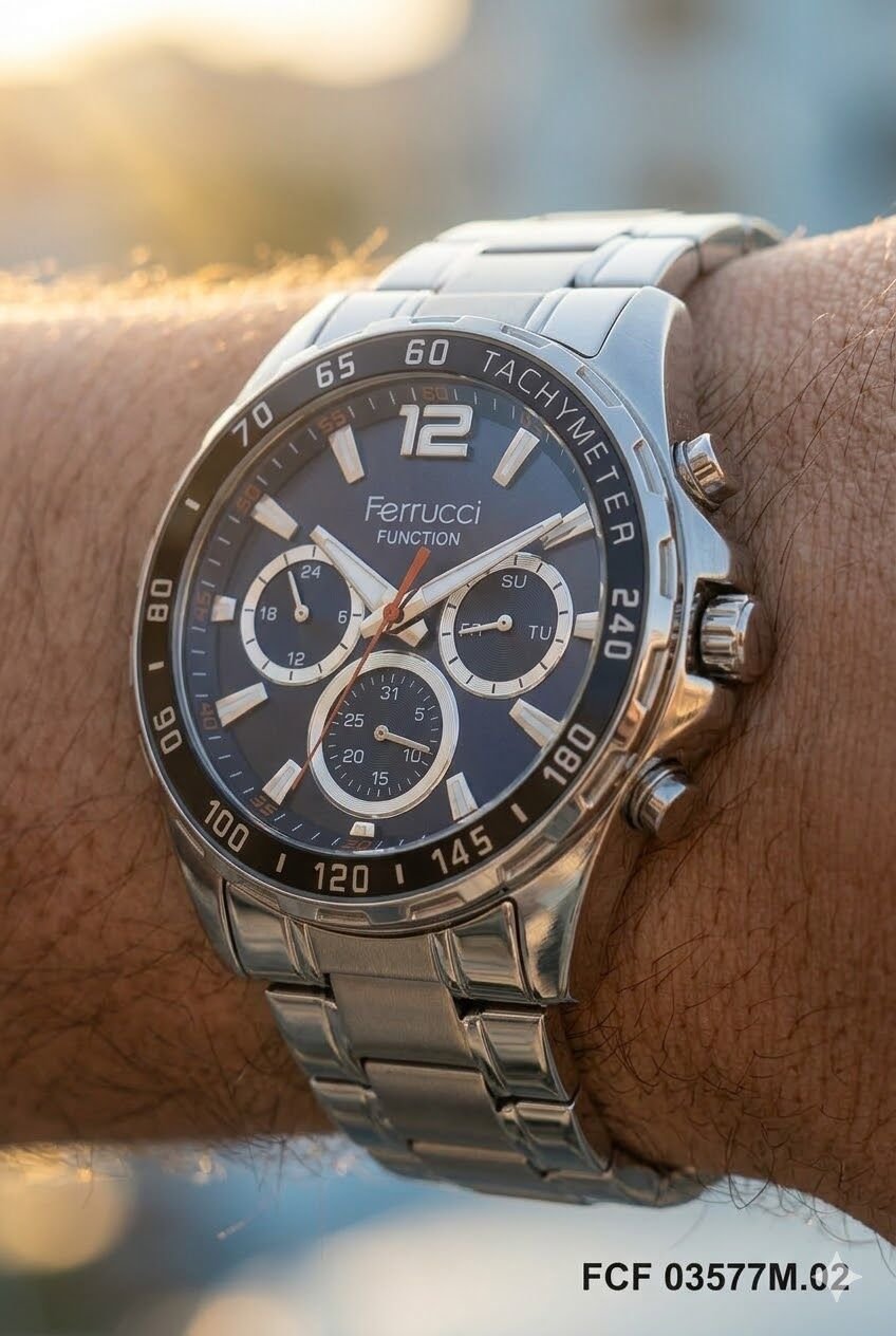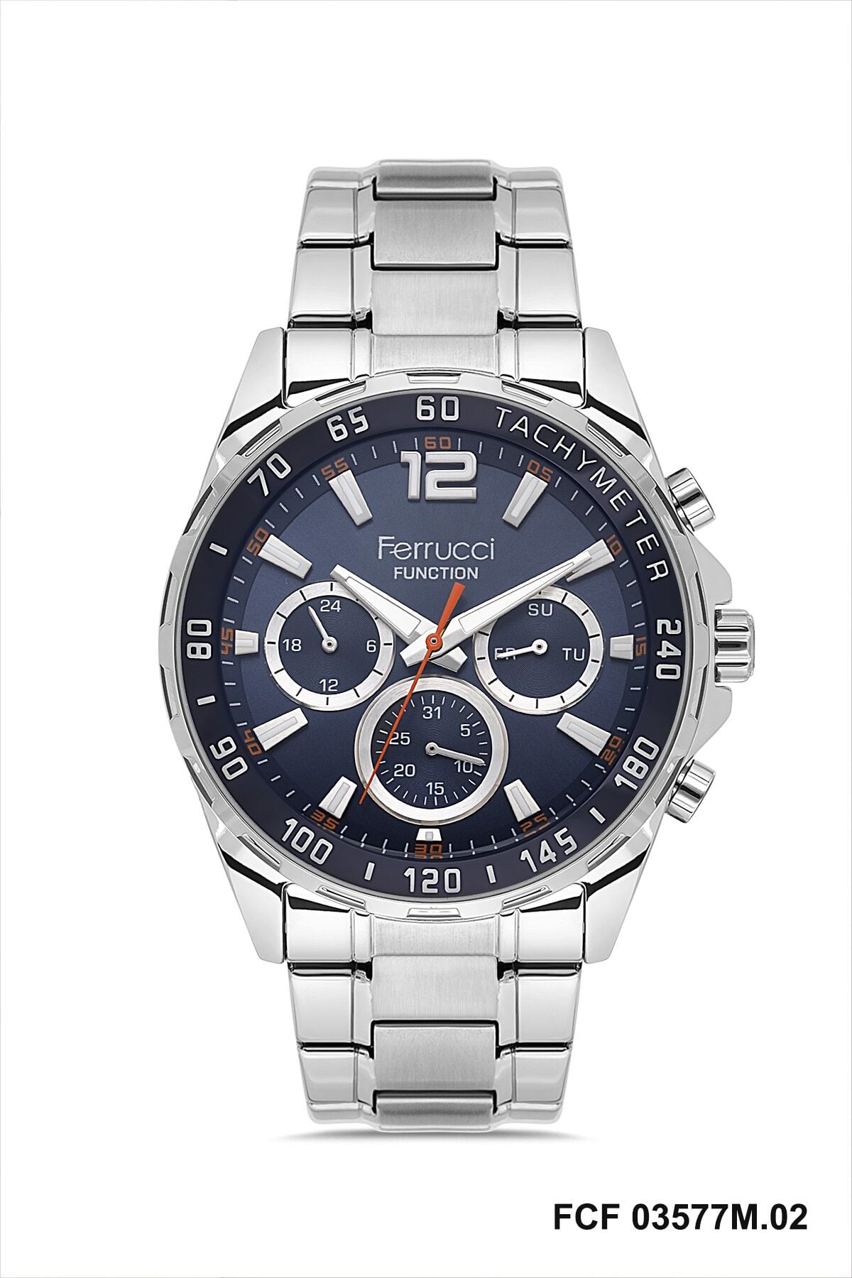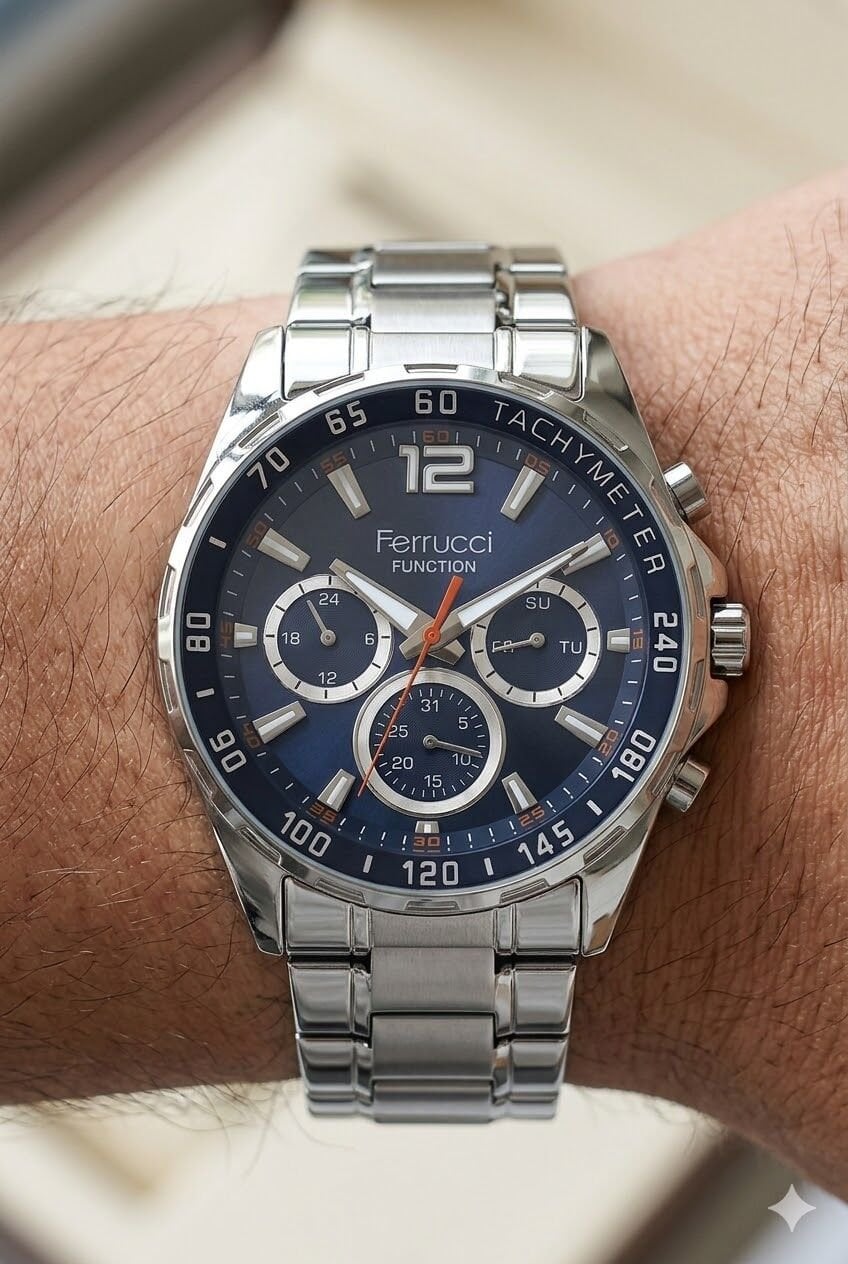 Ferrucci erkek kol saati yuvarlak kasa formu, güçlü bezel yapısı ve lacivert kadran tasarımıyla dikkat çekici bir görünüm sunar. Kadran üzerindeki çok fonksiyonlu detaylar modele sportif ve karakterli bir stil kazandırırken gümüş kasa ile uyumu saatin modern duruşunu tamamlar. Günlük kullanımda ve şehir stilinde rahatlıkla tercih edilebilecek şık bir tasarıma sahiptir.