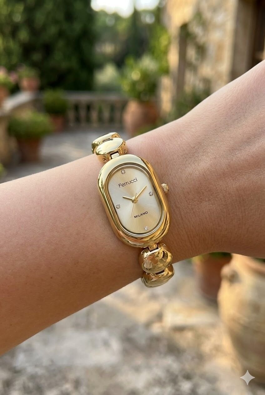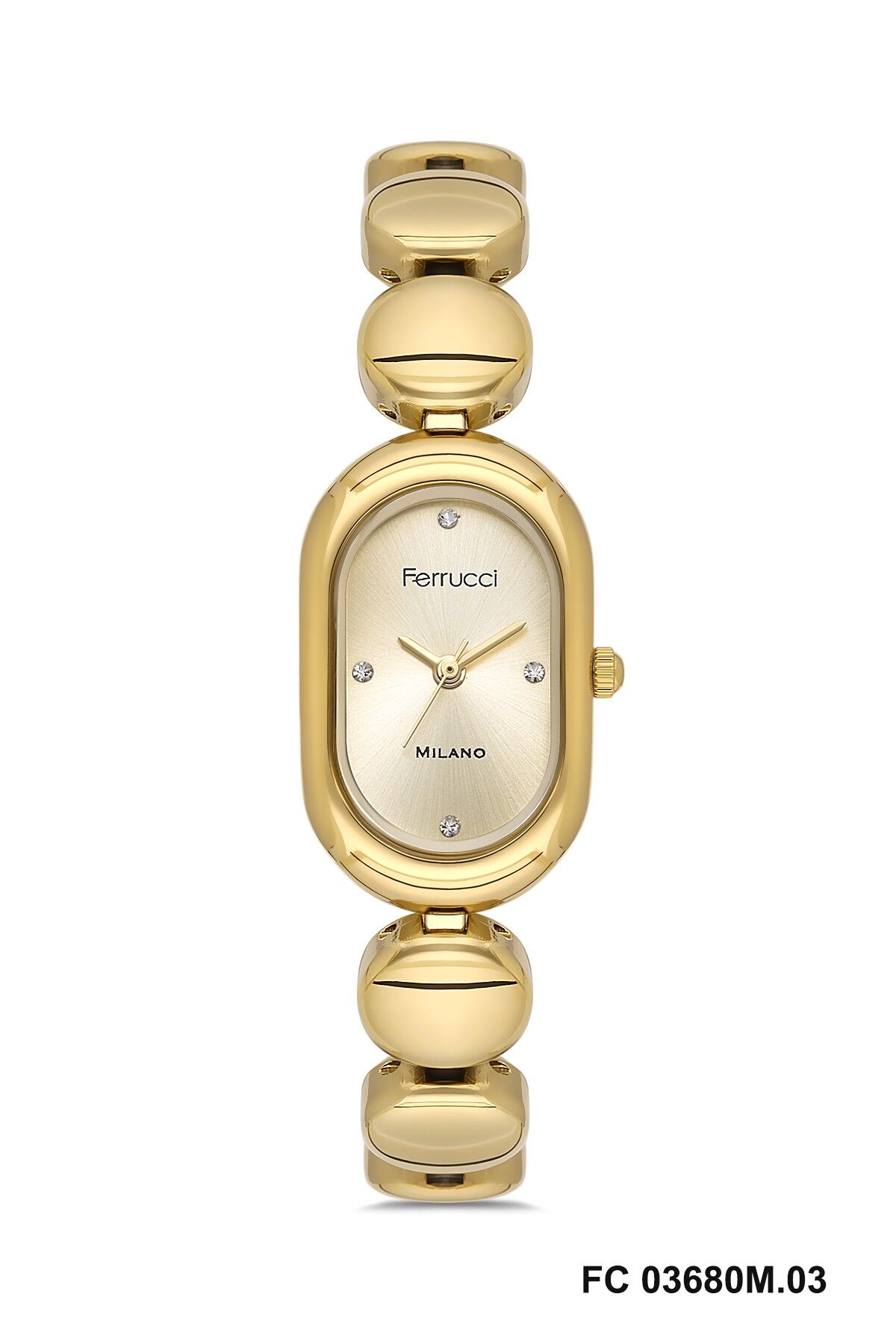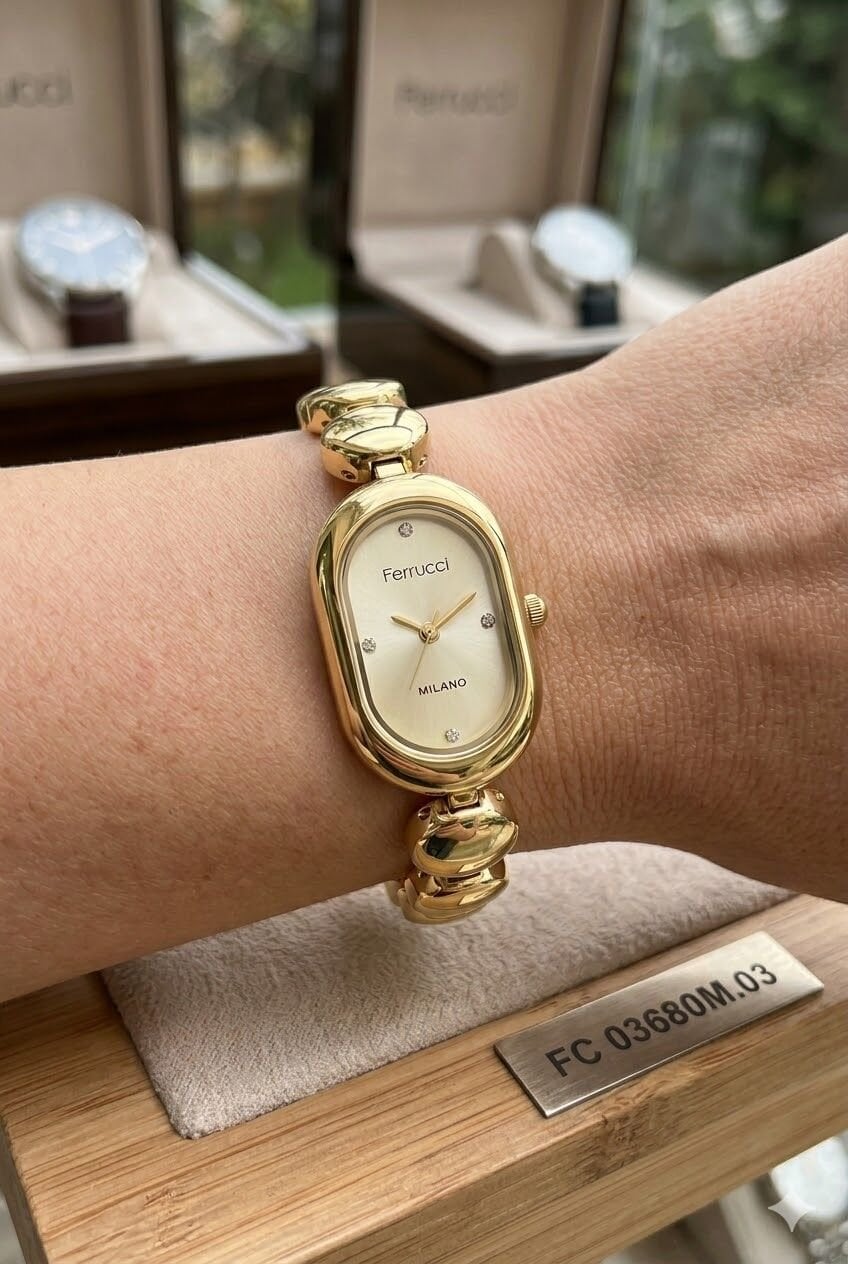 Ferrucci Milano tasarım çizgisini yansıtan bu model, oval formdaki zarif kasa yapısı ve parlak altın tonlarıyla öne çıkar. Kadran üzerindeki taş detayları saate şık ve feminen bir görünüm kazandırır. Günlük kombinlerden özel davet stiline kadar farklı kullanım alanlarına uyum sağlar.