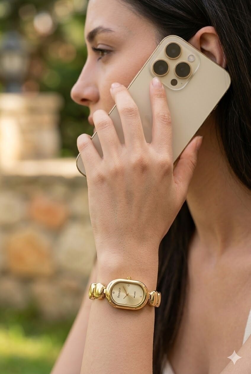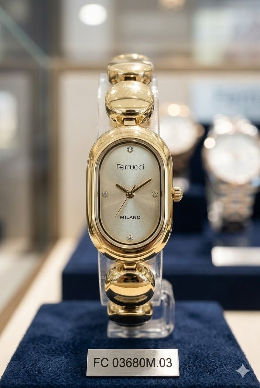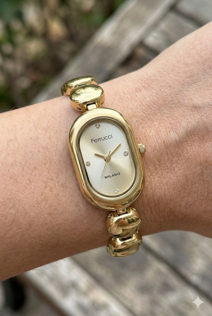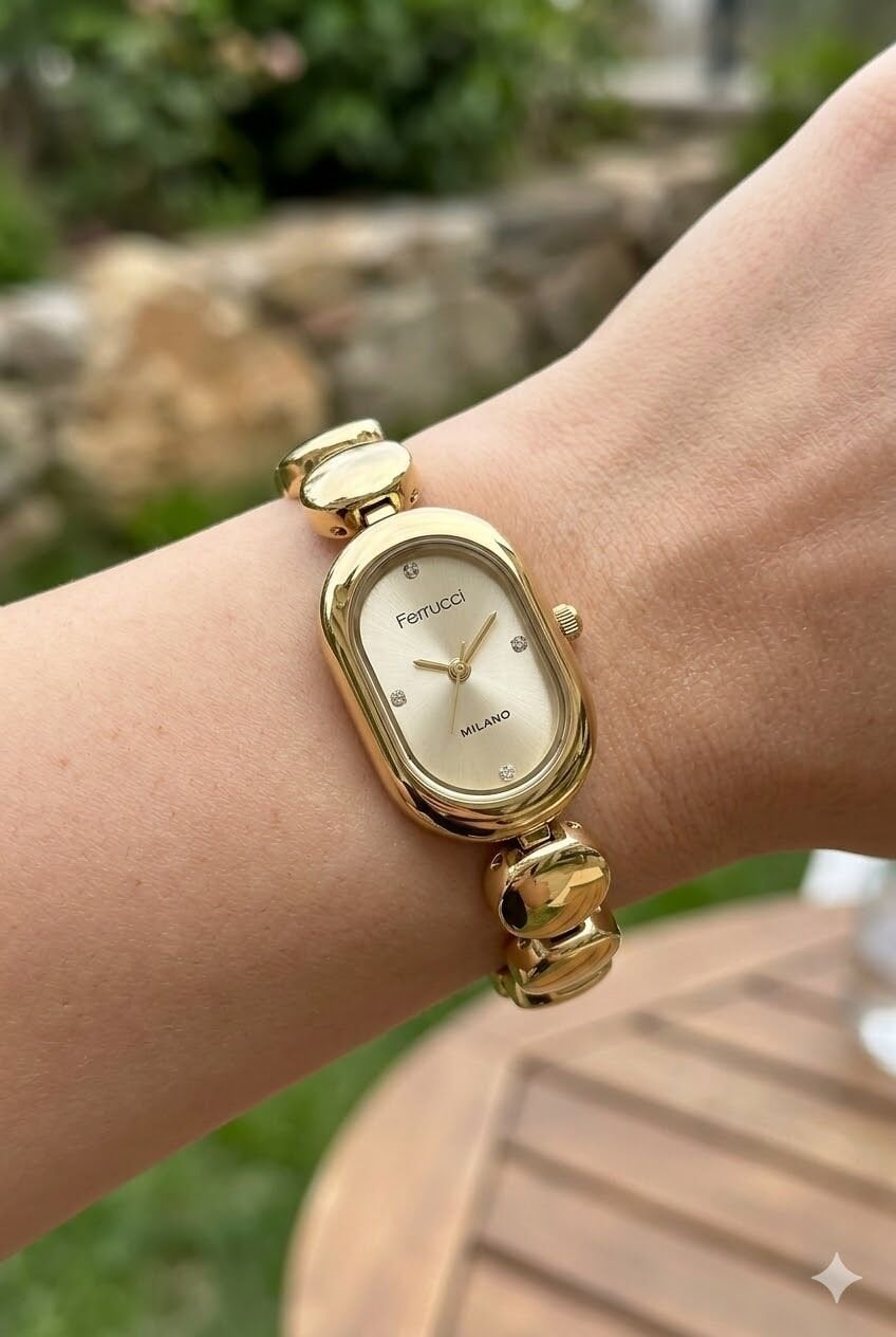 Ferrucci Milano tasarım çizgisini yansıtan bu model, oval formdaki zarif kasa yapısı ve parlak altın tonlarıyla öne çıkar. Kadran üzerindeki taş detayları saate şık ve feminen bir görünüm kazandırır. Günlük kombinlerden özel davet stiline kadar farklı kullanım alanlarına uyum sağlar.