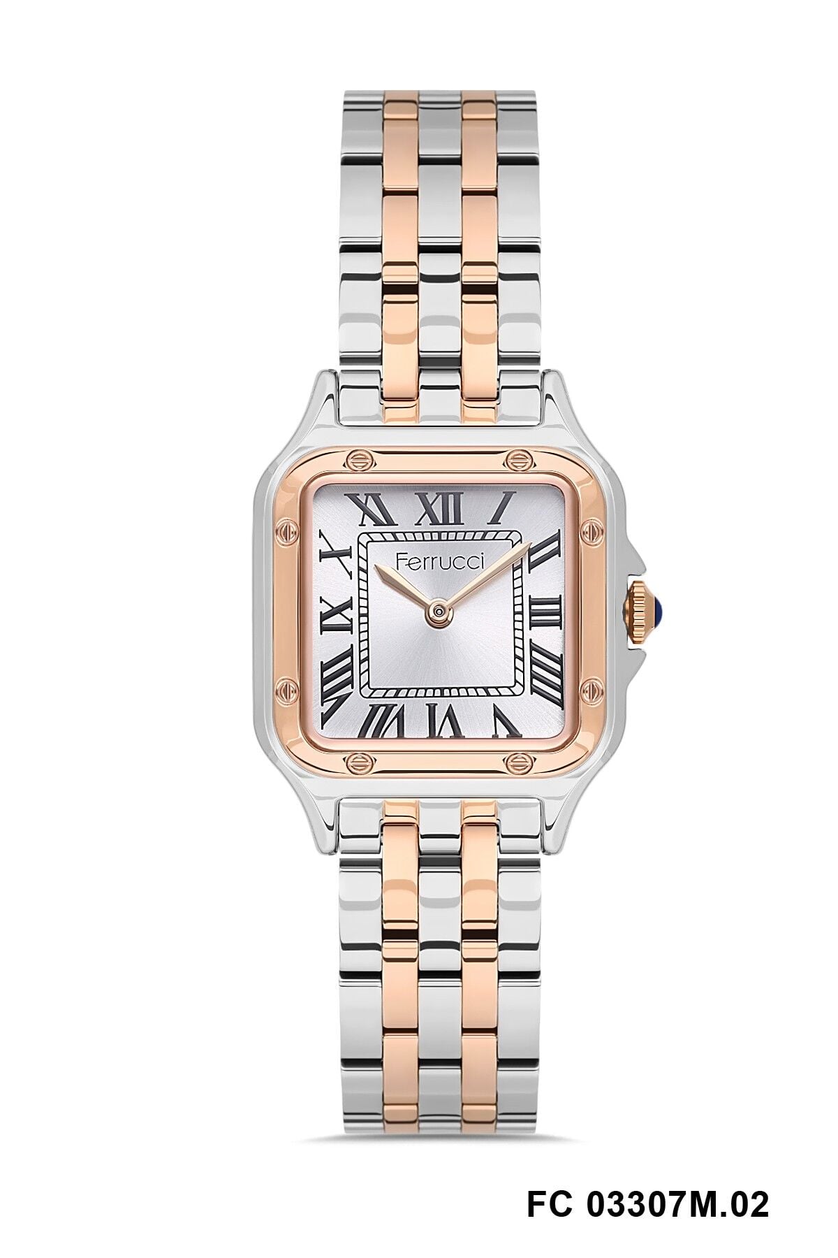 Ferrucci kadın kol saati kare kasa formu ve rose gümüş tonların zarif uyumuyla dikkat çeker. Kadrandaki klasik rakam detayları ve modern çizgiler modele güçlü ve şık bir karakter kazandırır. Günlük kullanımda ve özel gün kombinlerinde rahatlıkla tercih edilebilecek estetik bir tasarıma sahiptir.