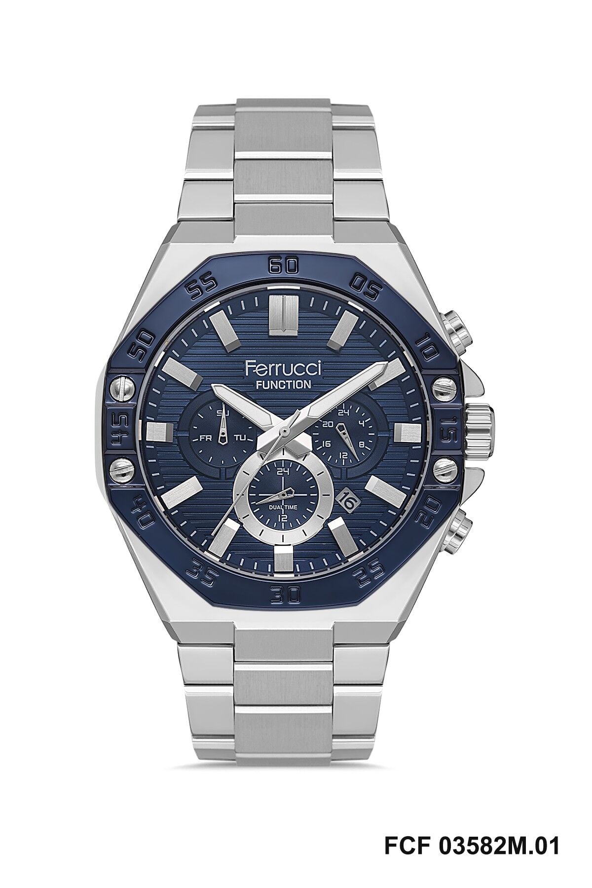 Ferrucci Kasa Erkek Kol Saati | 45 mm Çelik Kasa, Gümüş Metal Kordon, Lacivert Kadran