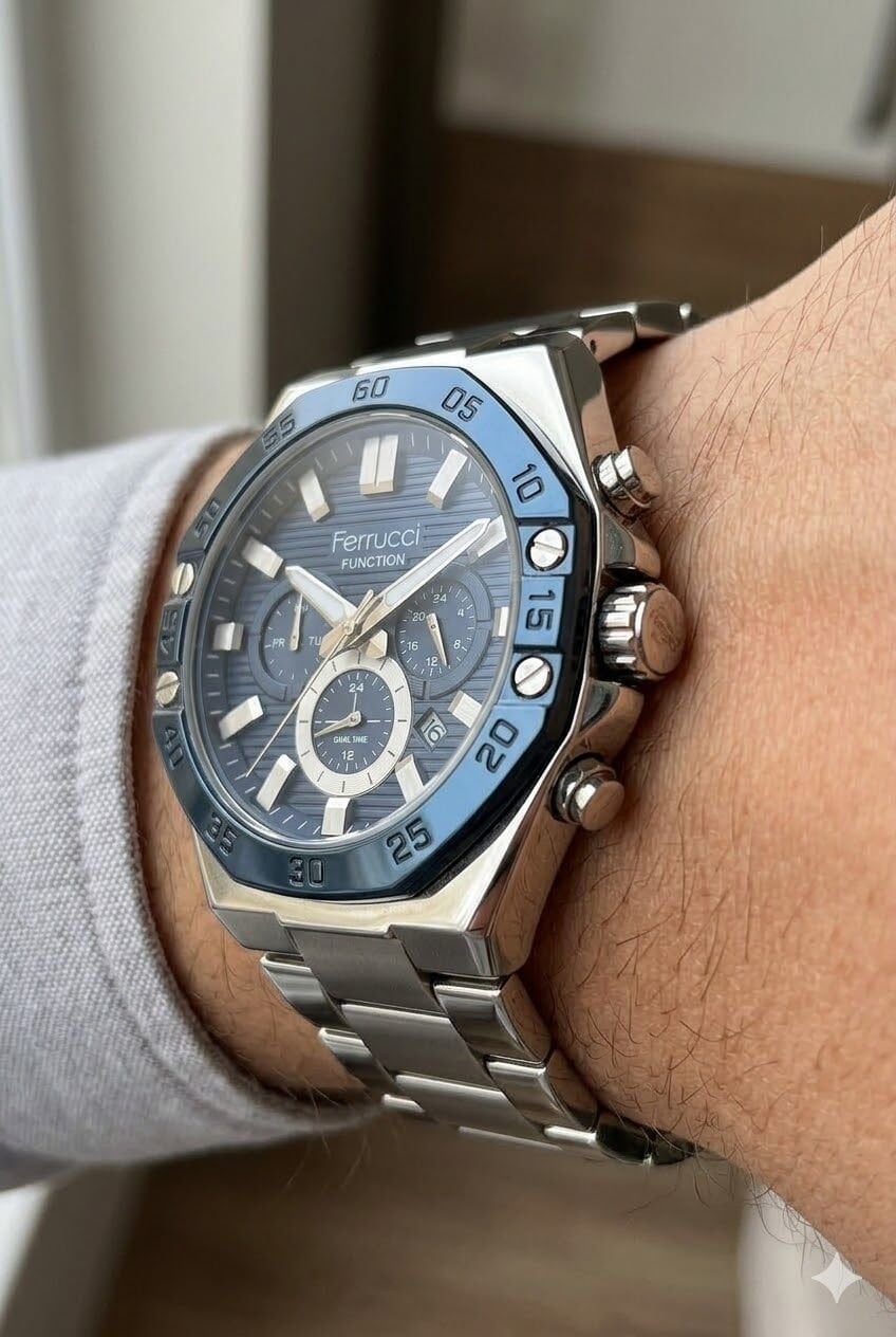 Ferrucci erkek kol saati yuvarlak kasa formu ve gümüş lacivert tonların güçlü uyumuyla dikkat çekici bir görünüm sunar. Çok fonksiyonlu kadran yapısı modele dinamik bir karakter kazandırırken belirgin bezel tasarımı saatin sportif ve modern stilini daha da öne çıkarır. Günlük kullanımda ve güçlü kombinlerde rahatlıkla tercih edilebilecek iddialı bir tasarıma sahiptir.