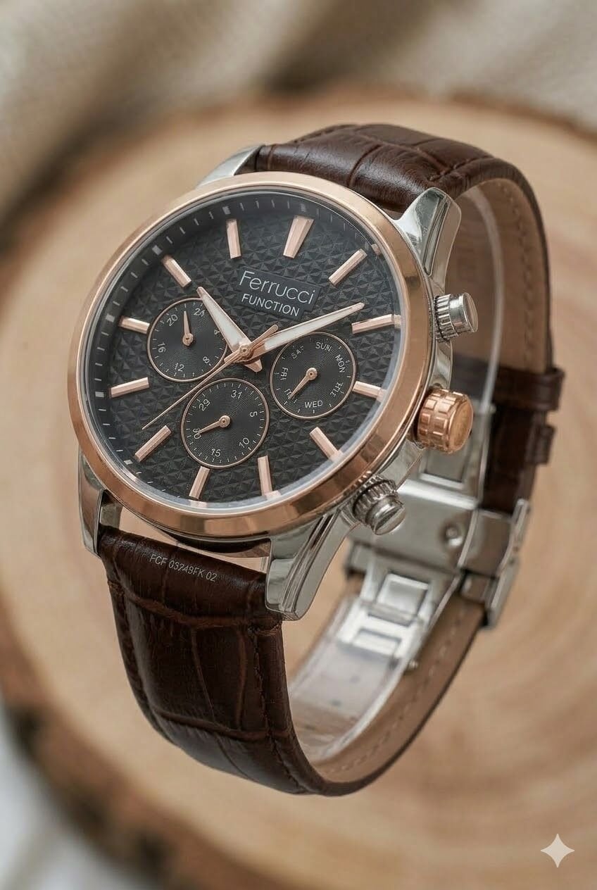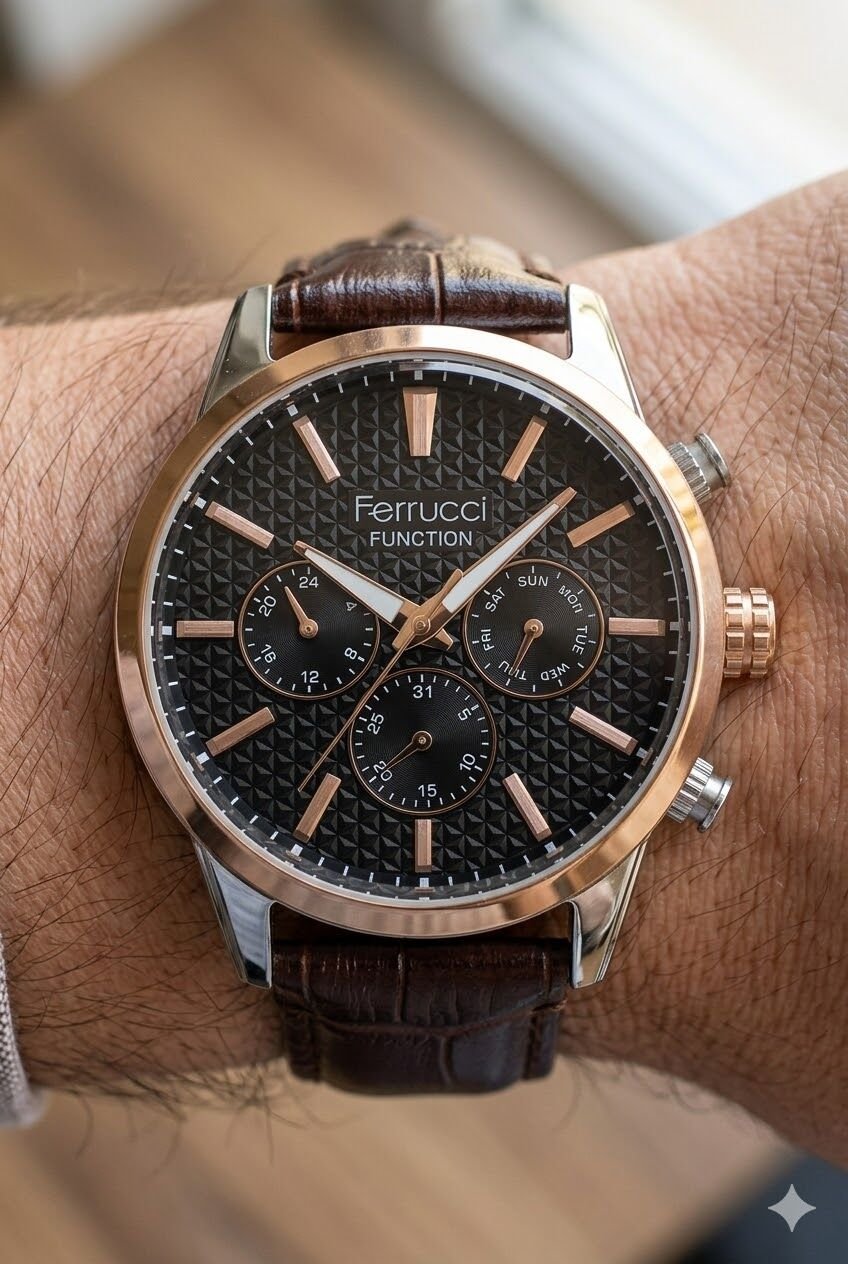 Ferrucci erkek kol saati yuvarlak kasa formu ve gümüş rose tonların güçlü uyumuyla dikkat çekici bir görünüm sunar. Çok fonksiyonlu kadran yapısı modele dinamik bir karakter kazandırırken desenli siyah kadran tasarımı saate modern ve iddialı bir stil katar. Koyu kahverengi deri kayış ile tamamlanan bu model, günlük kullanımda ve özel kombinlerde rahatlıkla tercih edilebilecek şık bir tasarıma sahiptir.