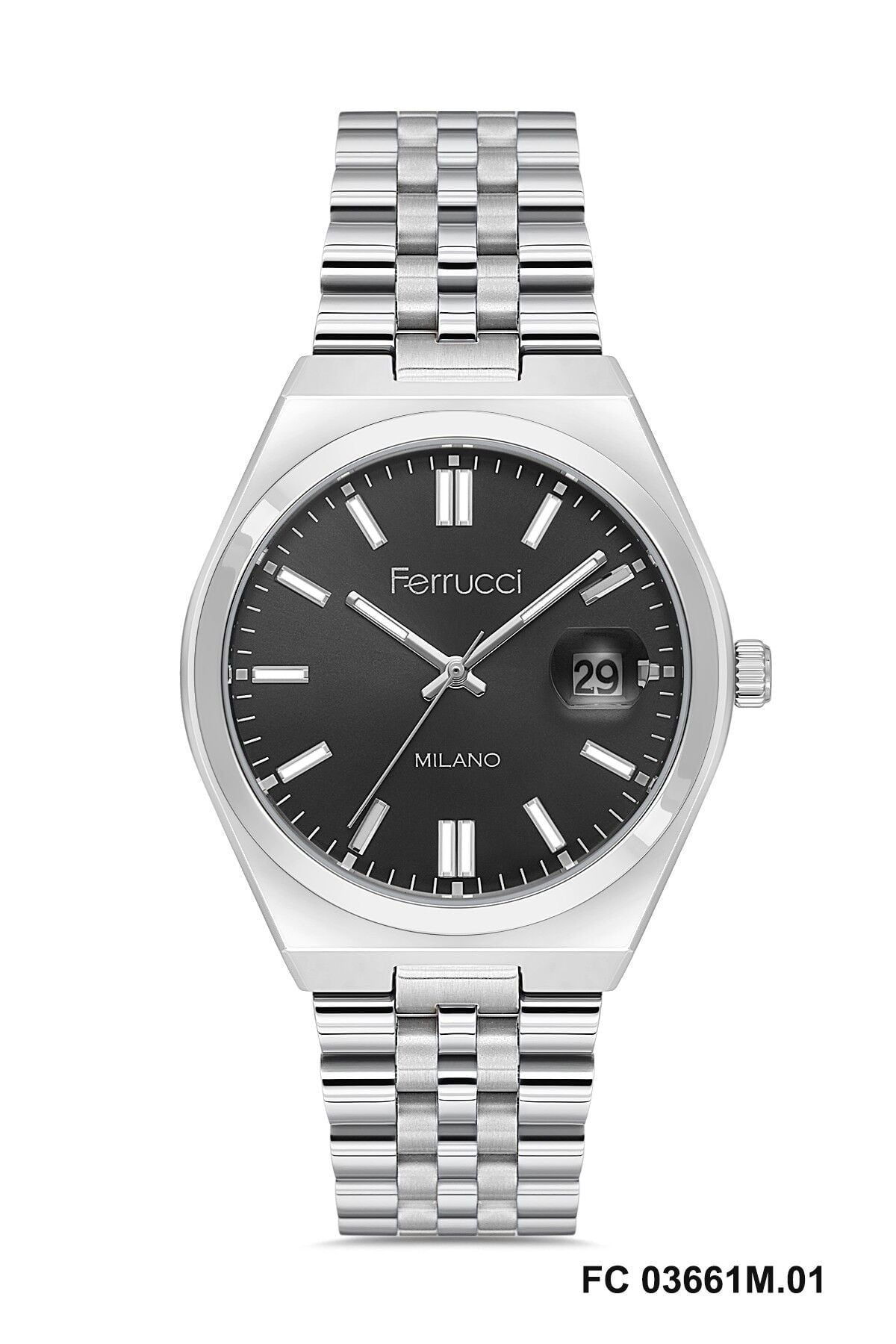 Ferrucci erkek kol saati güçlü tasarımı ve sade şıklığıyla günlük kullanımda dikkat çeken özel bir modeldir. Gümüş tonlu yuvarlak kasa ve metal kordon yapısı sayesinde bilekte modern ve dengeli bir duruş sunar. Ferrucci erkek kol saati arayanlar için hem kullanışlı hem de estetik bir seçenek oluşturan bu model, siyah kadranı ile klasik görünümü daha karakterli hale getirir. 40 mm kasa çapına sahip olan bu model, modern ve güçlü saat tercih eden erkek kullanıcılar için ideal bir seçimdir.