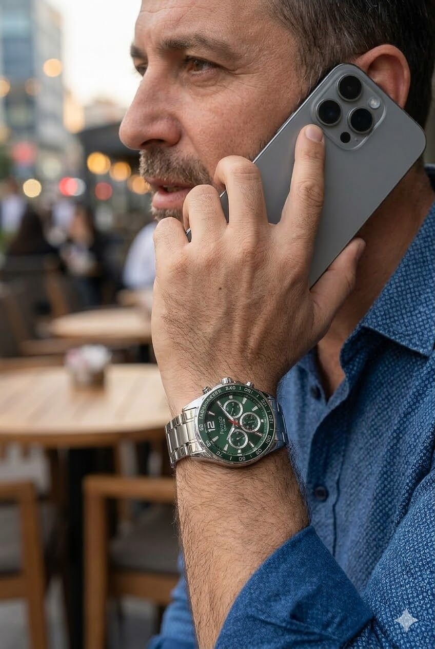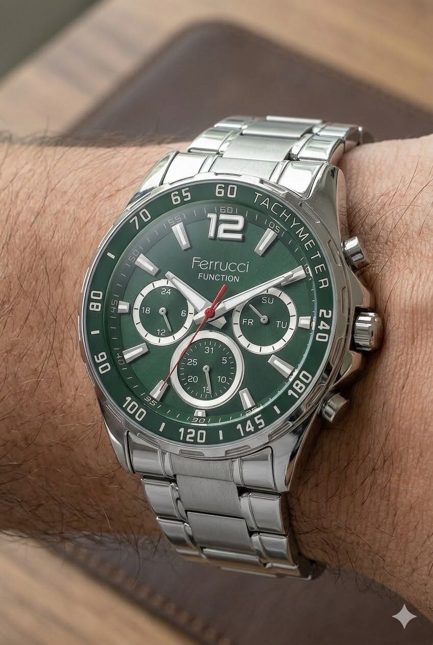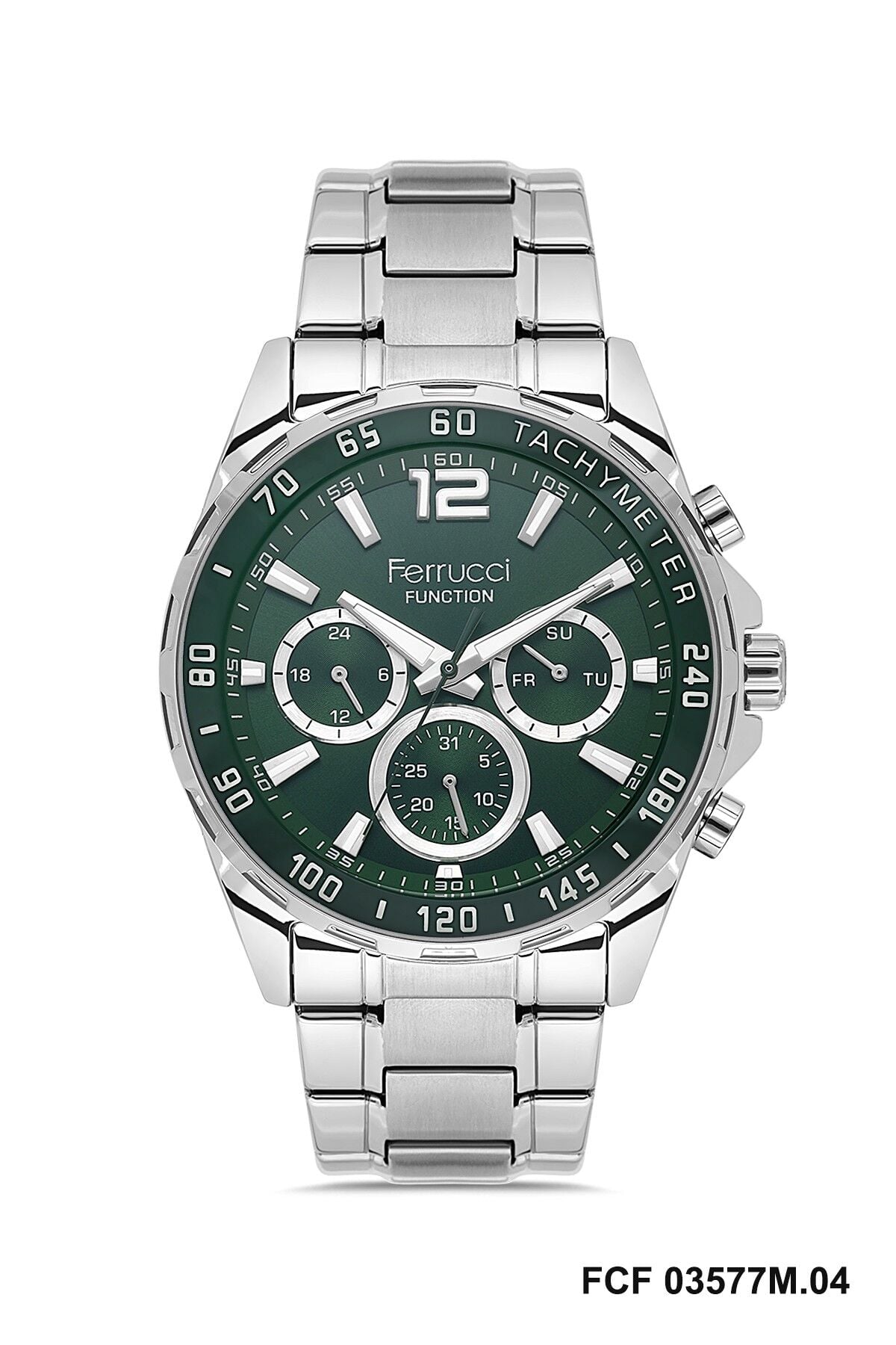 Ferrucci erkek kol saati yuvarlak kasa formu, güçlü bezel yapısı ve yeşil kadran tasarımıyla dikkat çekici bir görünüm sunar. Kadran üzerindeki çok fonksiyonlu detaylar modele sportif ve karakterli bir stil kazandırırken gümüş kasa ile uyumu saatin modern duruşunu tamamlar. Günlük kullanımda ve şehir stilinde rahatlıkla tercih edilebilecek şık bir tasarıma sahiptir.