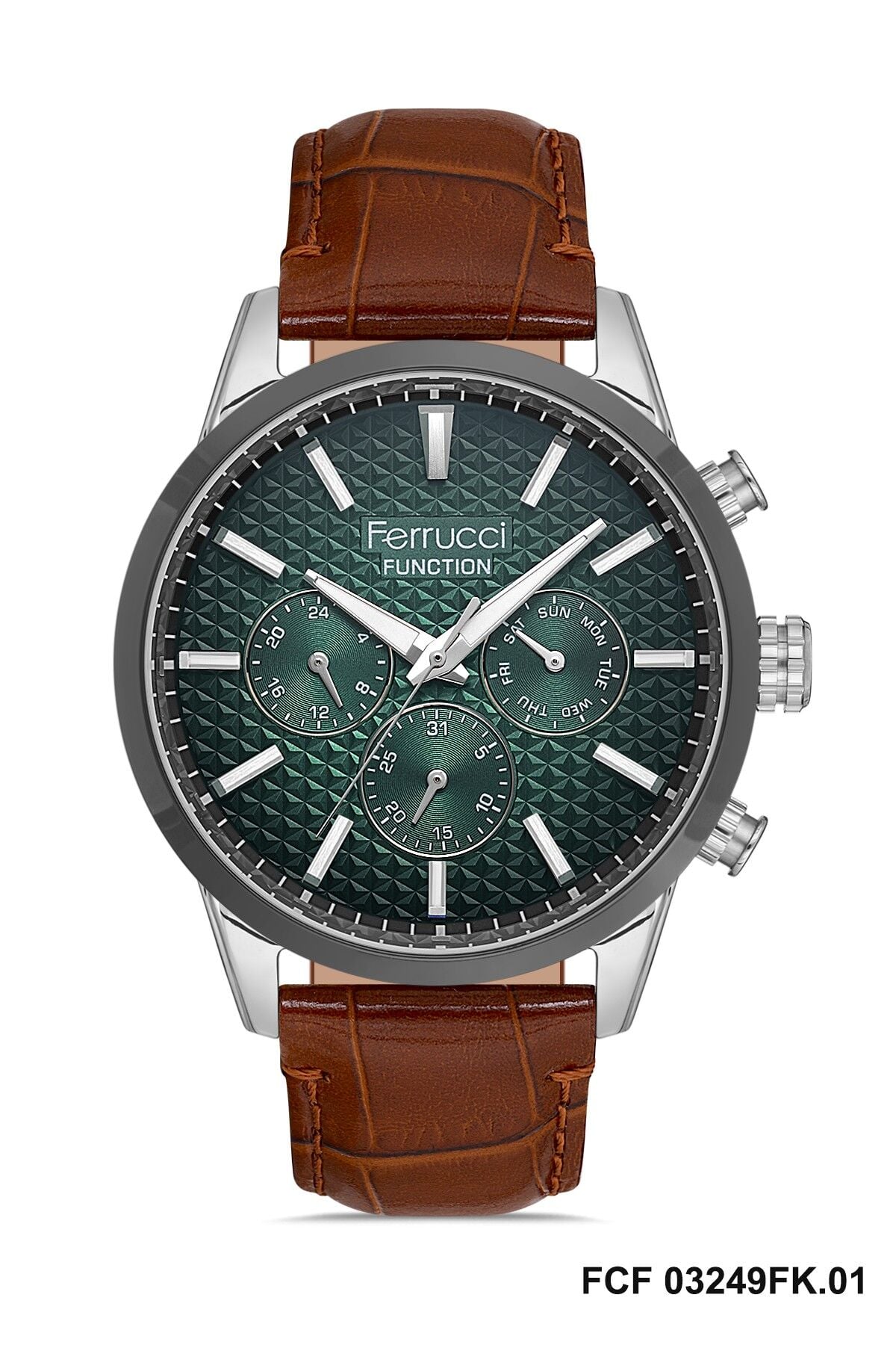 Ferrucci erkek kol saati yuvarlak kasa formu ve gümüş siyah tonların güçlü uyumuyla dikkat çekici bir görünüm sunar. Çok fonksiyonlu kadran yapısı modele dinamik bir karakter kazandırırken desenli yeşil kadran tasarımı saate özgün ve modern bir stil katar. Açık kahverengi deri kayış ile tamamlanan bu model, günlük kullanımda ve özel kombinlerde rahatlıkla tercih edilebilecek iddialı bir tasarıma sahiptir.