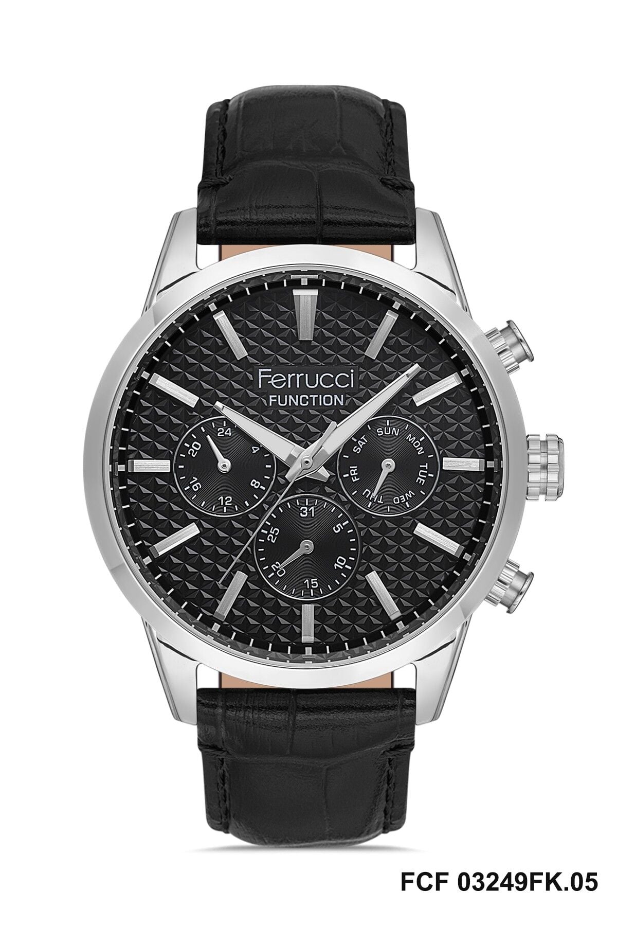 Ferrucci erkek kol saati yuvarlak kasa formu ve gümüş siyah tonların güçlü uyumuyla dikkat çekici bir görünüm sunar. Çok fonksiyonlu kadran yapısı modele dinamik bir karakter kazandırırken desenli siyah kadran tasarımı saate modern ve güçlü bir stil katar. Günlük kullanımda ve özel kombinlerde rahatlıkla tercih edilebilecek şık bir tasarıma sahiptir.