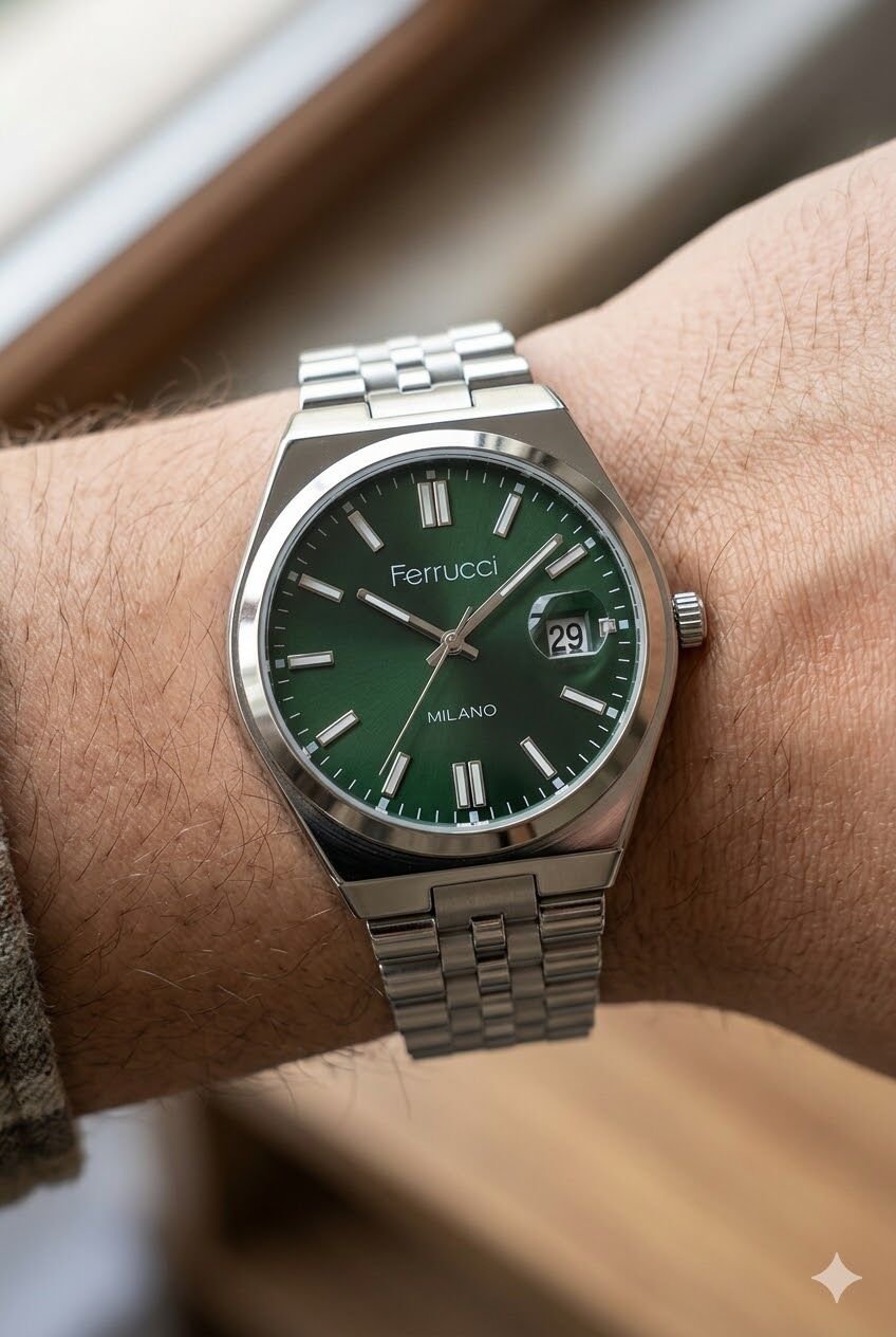 Ferrucci erkek kol saati yuvarlak kasa formu ve gümüş tonların modern uyumuyla güçlü bir görünüm sunar. Yeşil kadran detayı modele sade ama etkileyici bir karakter kazandırırken takvim penceresi günlük kullanımda pratiklik sağlar. Günlük kombinlerde ve klasik stillerde rahatlıkla tercih edilebilecek şık bir tasarıma sahiptir.