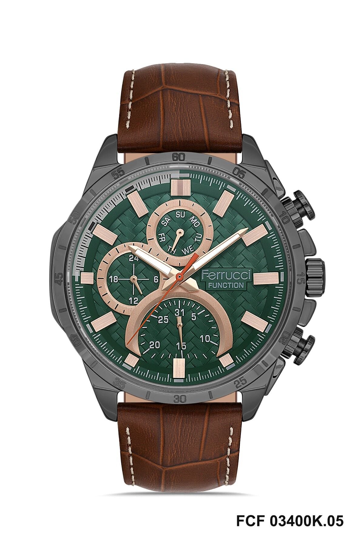 Ferrucci erkek kol saati yuvarlak kasa formu ve siyah tonların güçlü uyumuyla dikkat çekici bir görünüm sunar. Çok fonksiyonlu kadran yapısı modele dinamik bir karakter kazandırırken yeşil kadran ve açık kahverengi deri kayış kombinasyonu saatin sportif ve özgün stilini öne çıkarır. Günlük kullanımda ve özel kombinlerde rahatlıkla tercih edilebilecek iddialı bir tasarıma sahiptir.