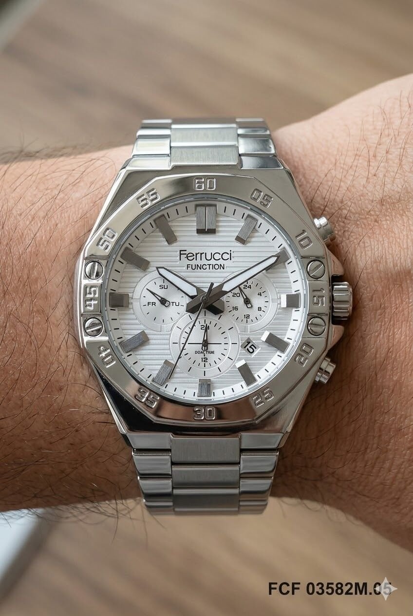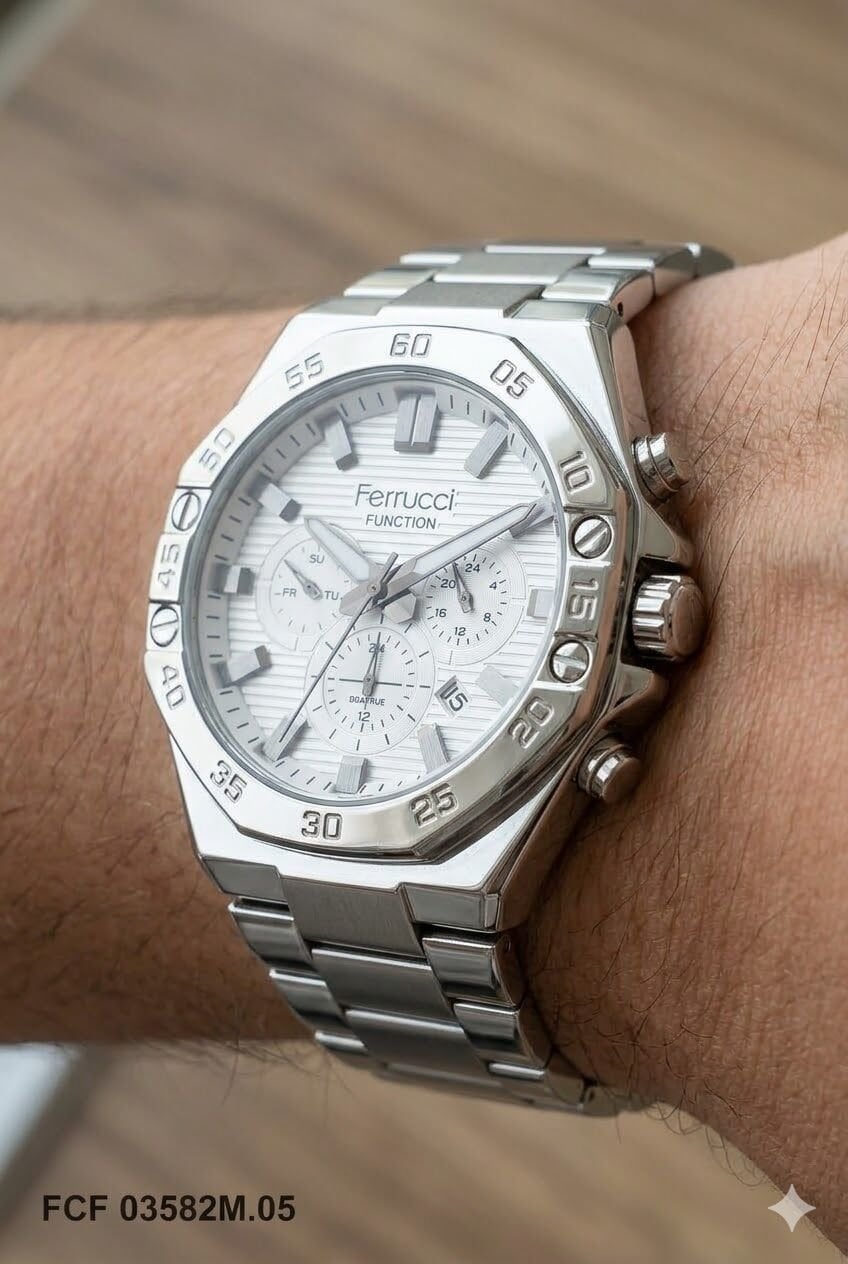 Ferrucci erkek kol saati güçlü tasarımı ve çok fonksiyonlu yapısıyla günlük kullanımda şıklık ve kullanışlılığı bir arada sunar. Gümüş tonlu yuvarlak kasa ve metal kordon yapısı sayesinde bilekte modern ve dikkat çekici bir duruş sağlar. Ferrucci erkek kol saati arayanlar için hem estetik hem de işlevsel bir seçenek sunan bu model, gümüş kadranı ile güçlü ve sade bir görünüm kazandırır. 45 mm kasa çapına sahip olan bu model, büyük ve iddialı saat tercih eden erkek kullanıcılar için ideal bir seçimdir.